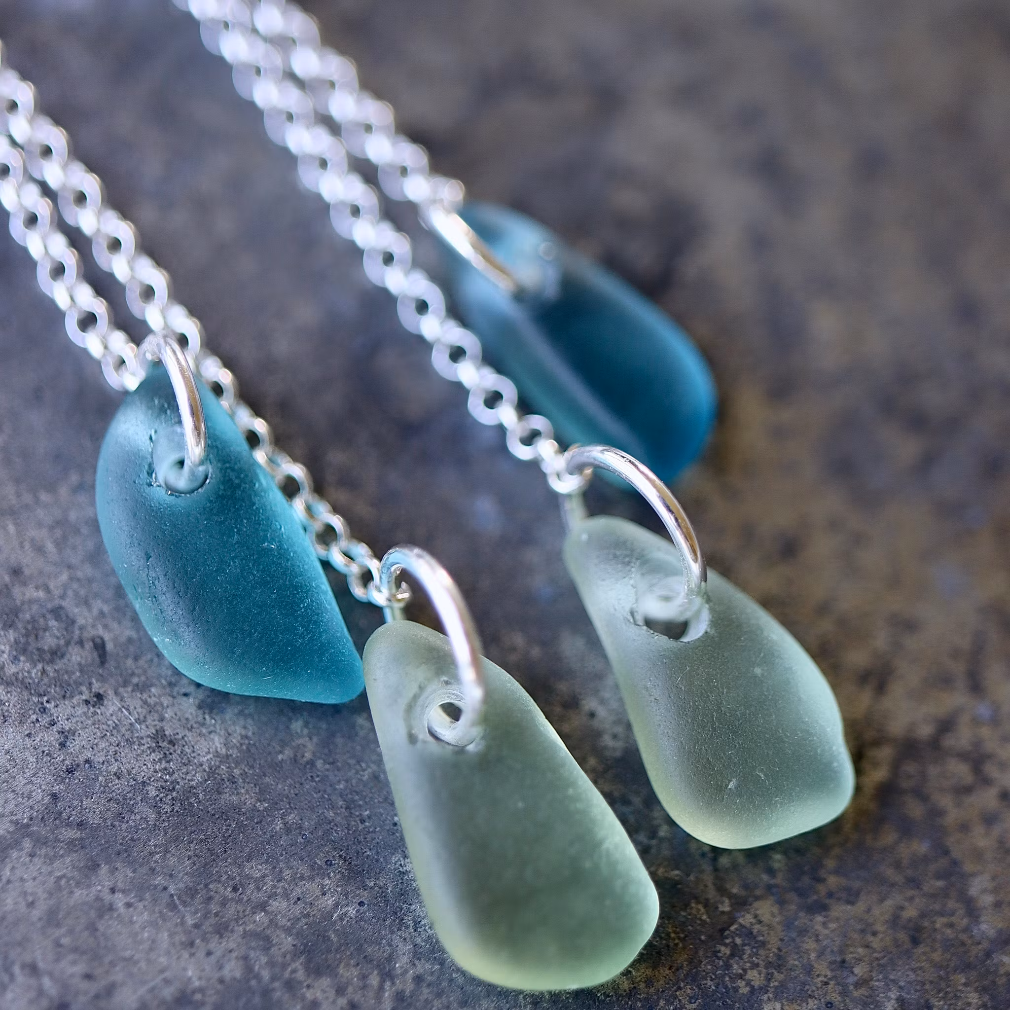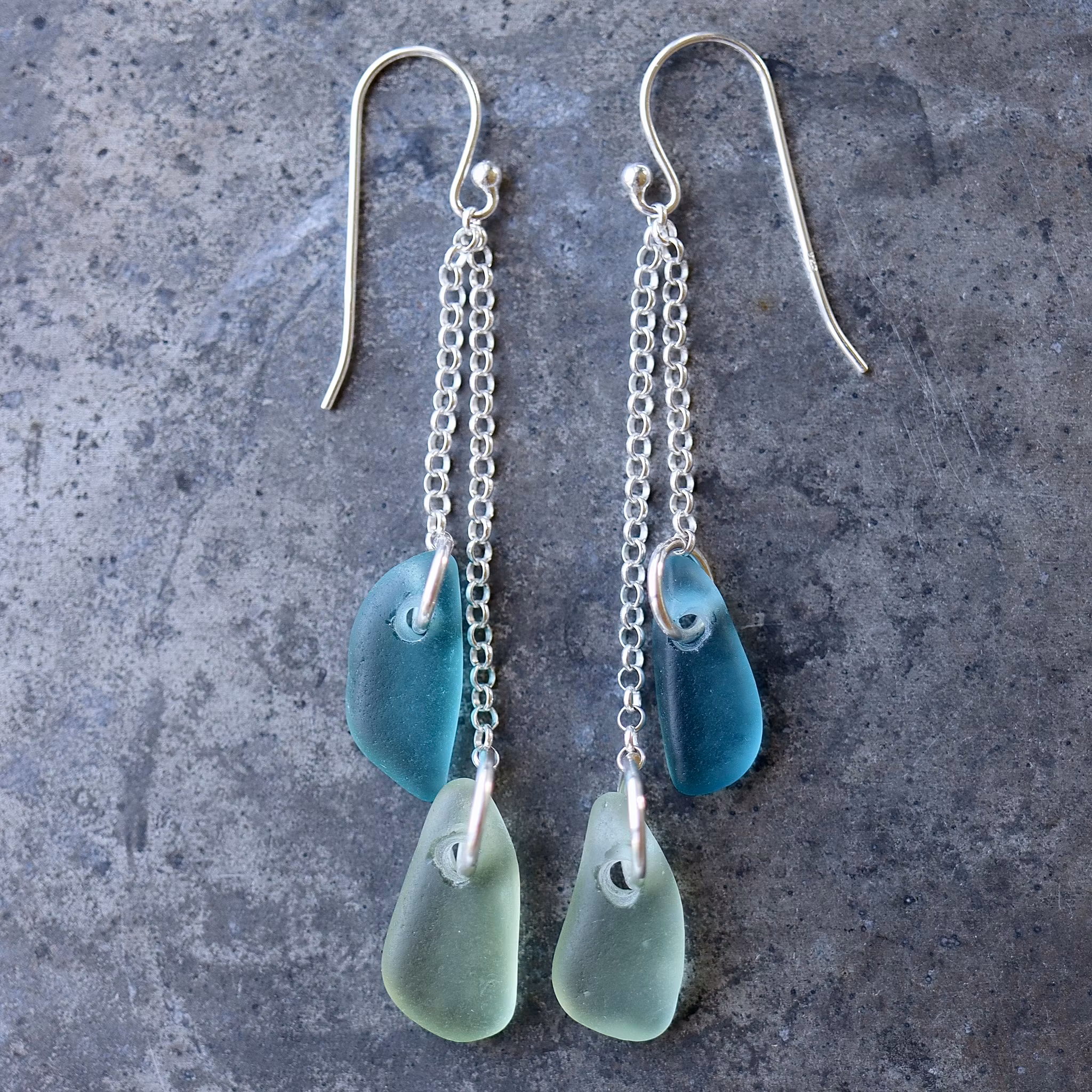 Observera att havsglasbitarna i paret inte är identiska, utan varierar en aning i form, tjocklek och färgnyans.
