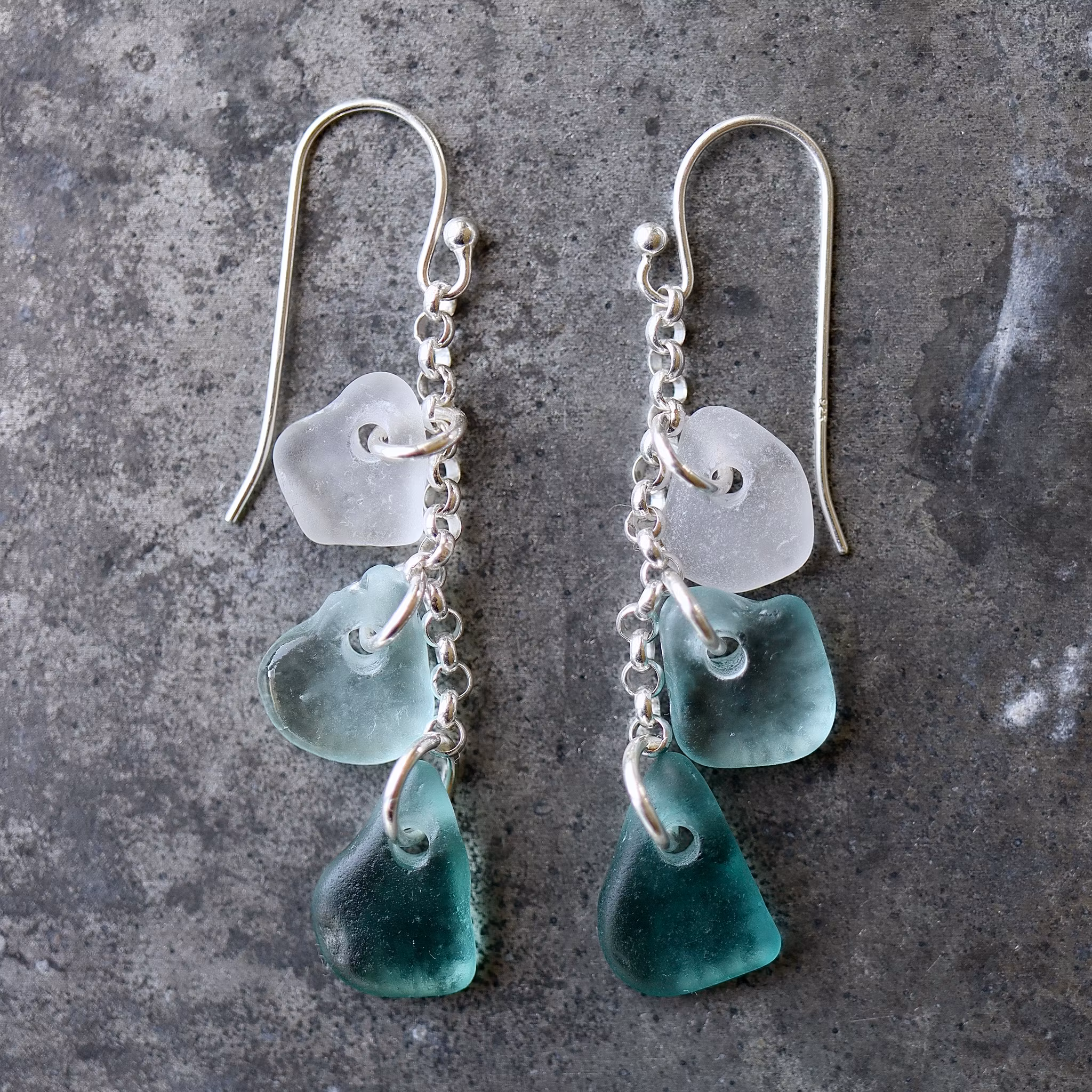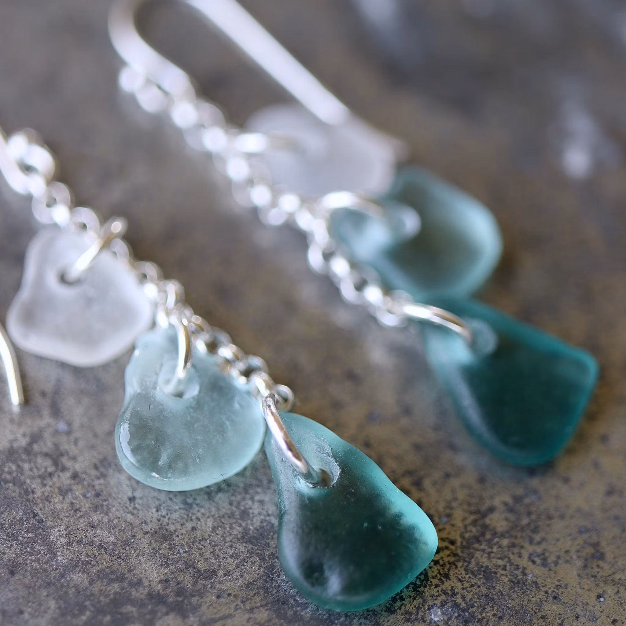 Par med sex matchande havsglas, örkrokar och kedja av äkta silver.