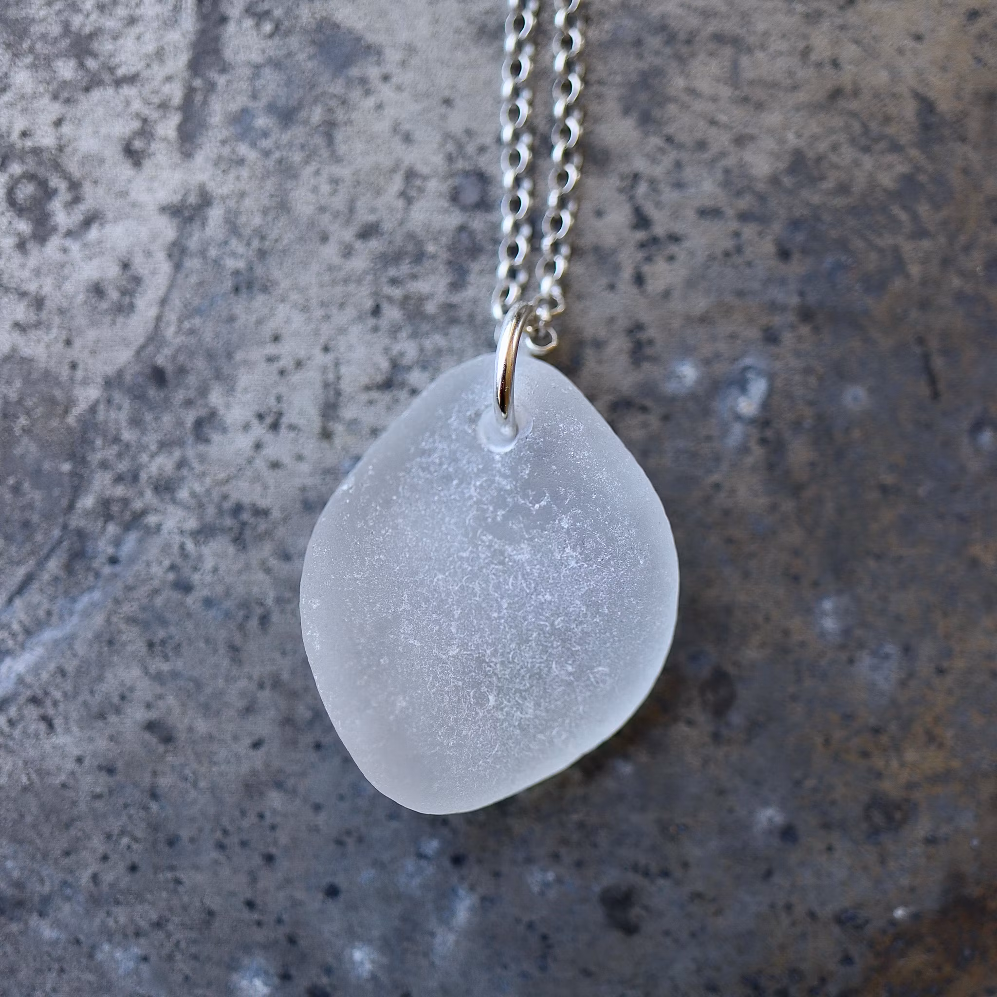 Halskedja av äkta silver, välj mellan 45, 50 och 60 cm, i låset sitter en plexitag "Havsglas" tillverkad i Sverige.