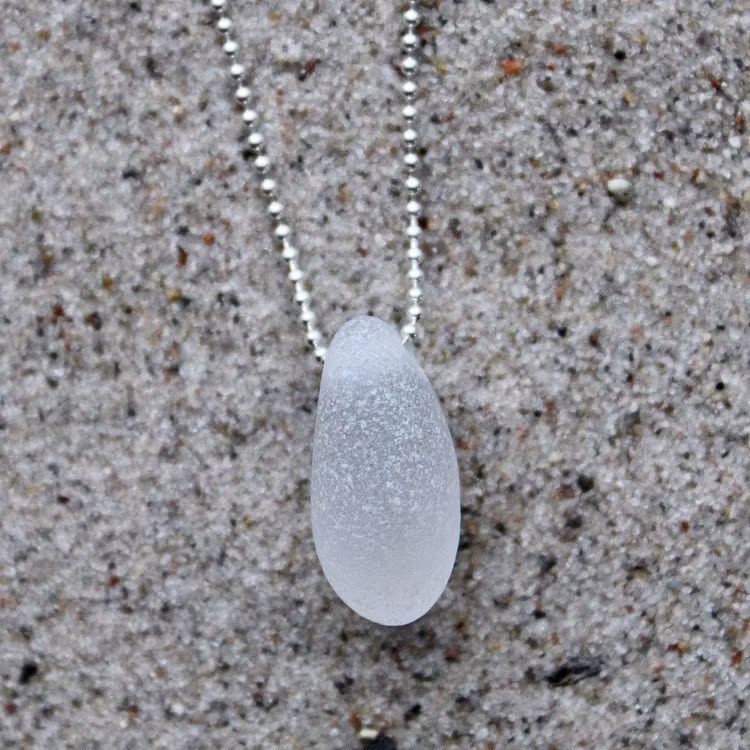 Havsglaset är samlat längs Skånes stränder och helt obearbetat, endast varsamt tvättat och borrat.
