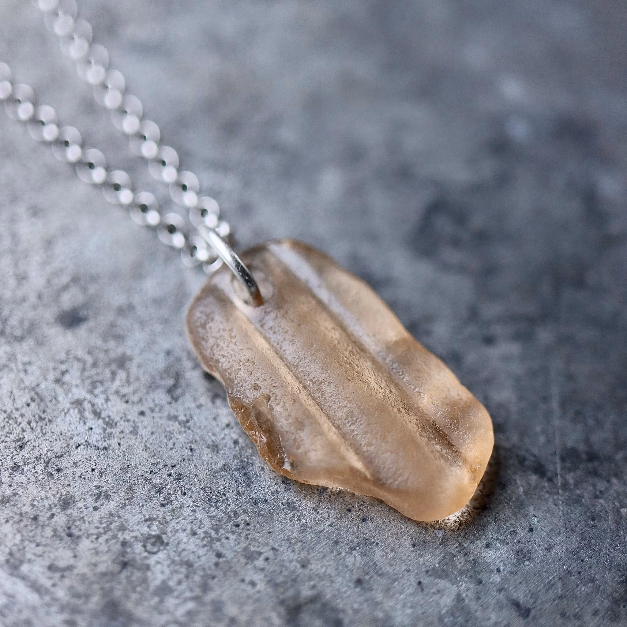 Havsglaset är samlat längs Skånes stränder och helt obearbetat, endast varsamt tvättat och borrat.