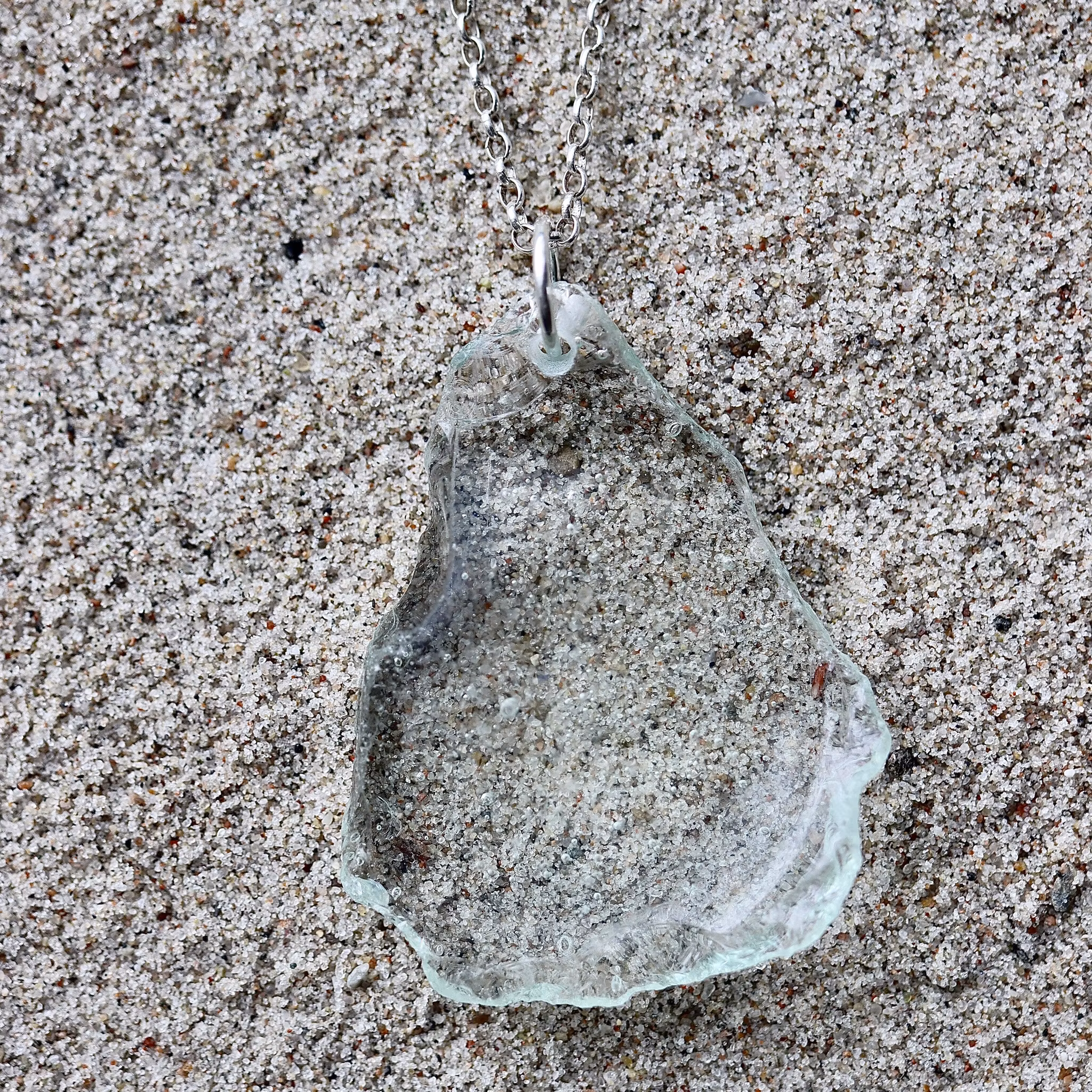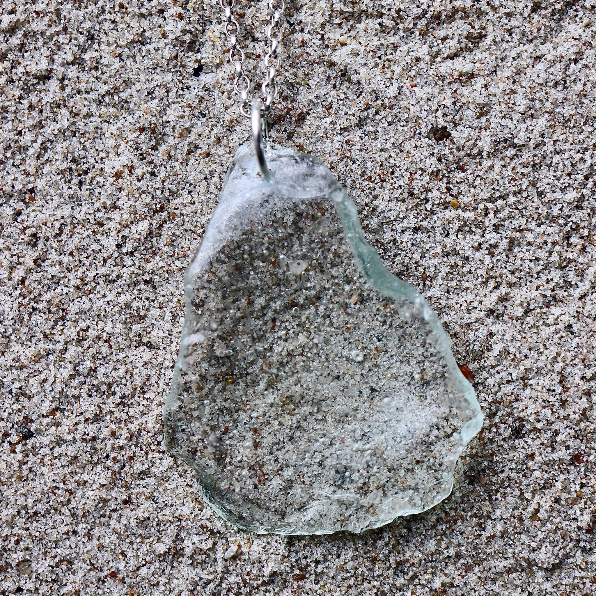 Havsglaset är samlat längs Skånes stränder och helt obearbetat, endast varsamt tvättat och borrat.