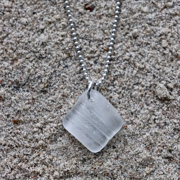 Havsglaset är samlat längs Skånes stränder och helt obearbetat, endast varsamt tvättat och borrat.