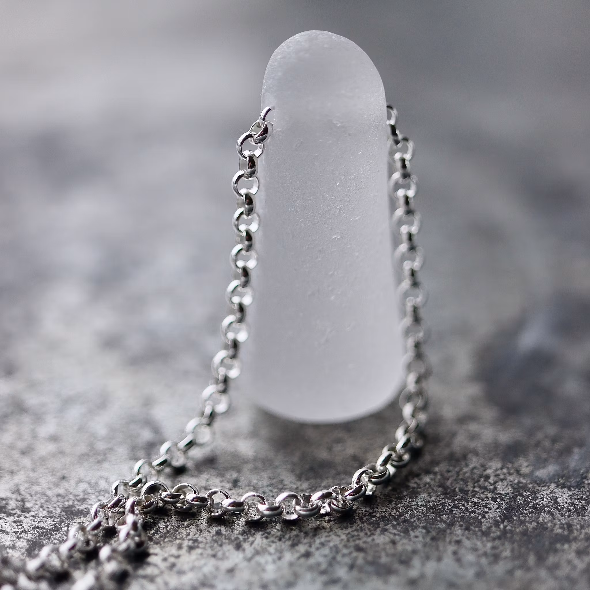Halskedja av äkta silver, välj mellan 45, 50 och 60 cm, i låset sitter en plexitag "Havsglas" tillverkad i Sverige.