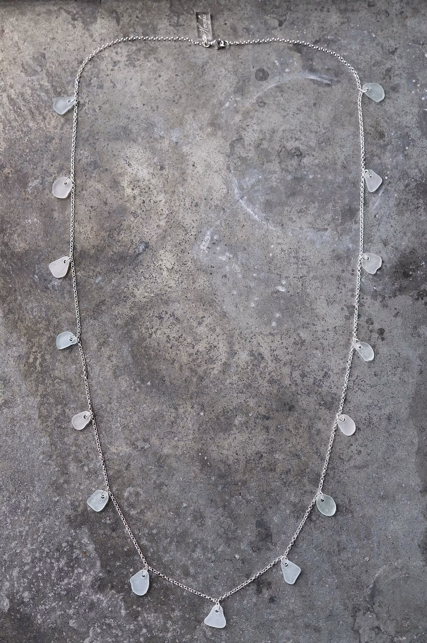 Femton matchande bitar i en 85 cm halskedja av äkta silver, i låset sitter en plexitag "Havsglas" tillverkad i Sverige.