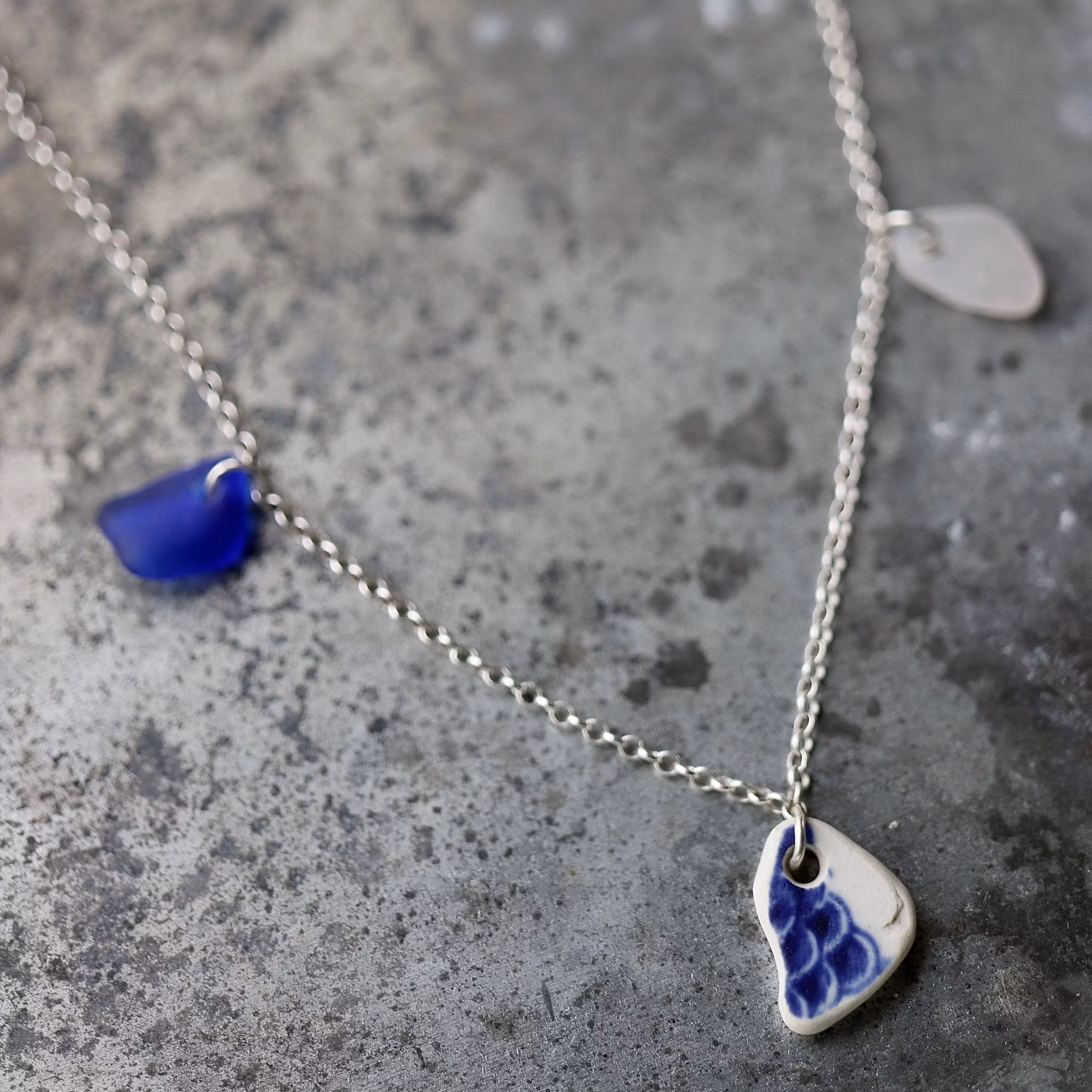 Havsglaset och havsporslinet är samlat längs Skånes stränder och helt obearbetat, endast varsamt tvättat och borrat.