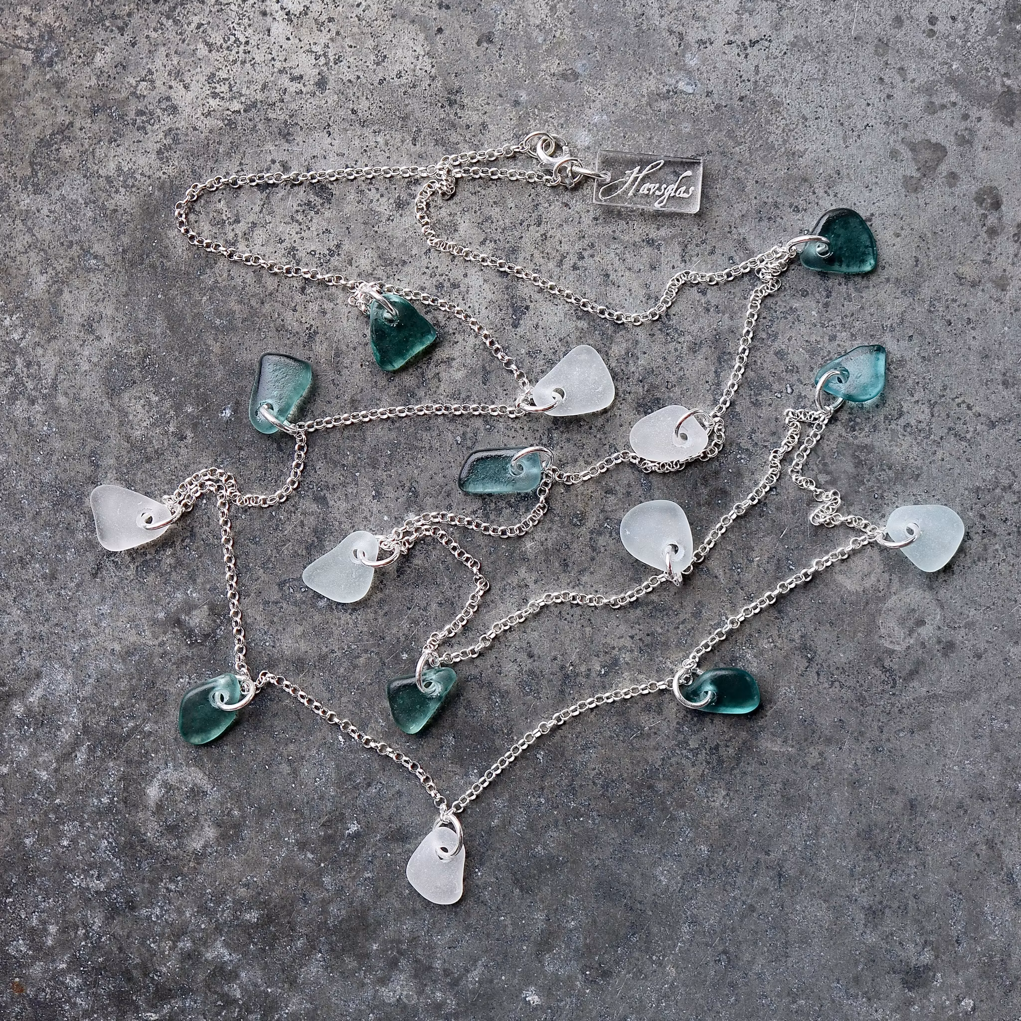 Femton matchande bitar i en 85 cm halskedja av äkta silver, i låset sitter en plexitag "Havsglas" tillverkad i Sverige.