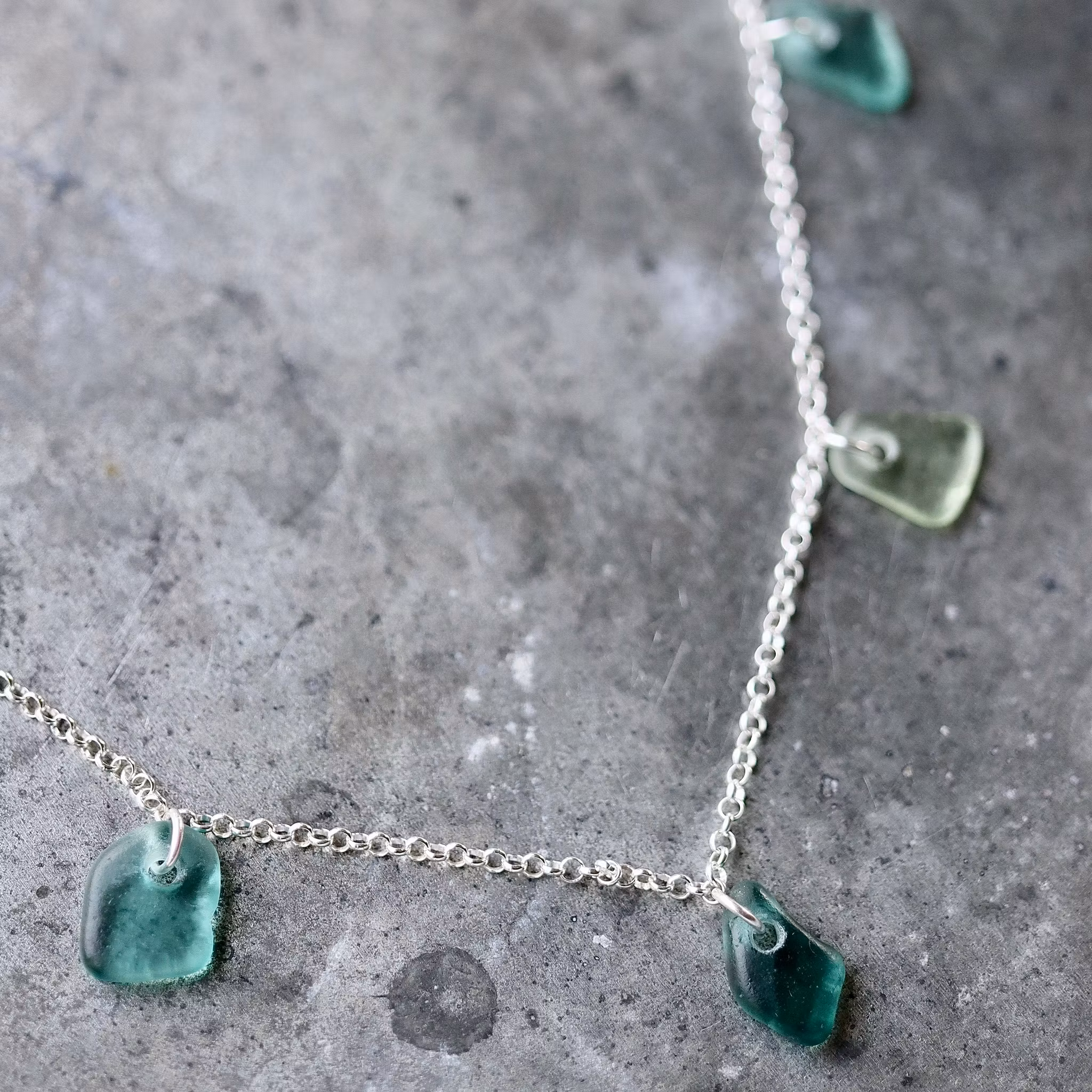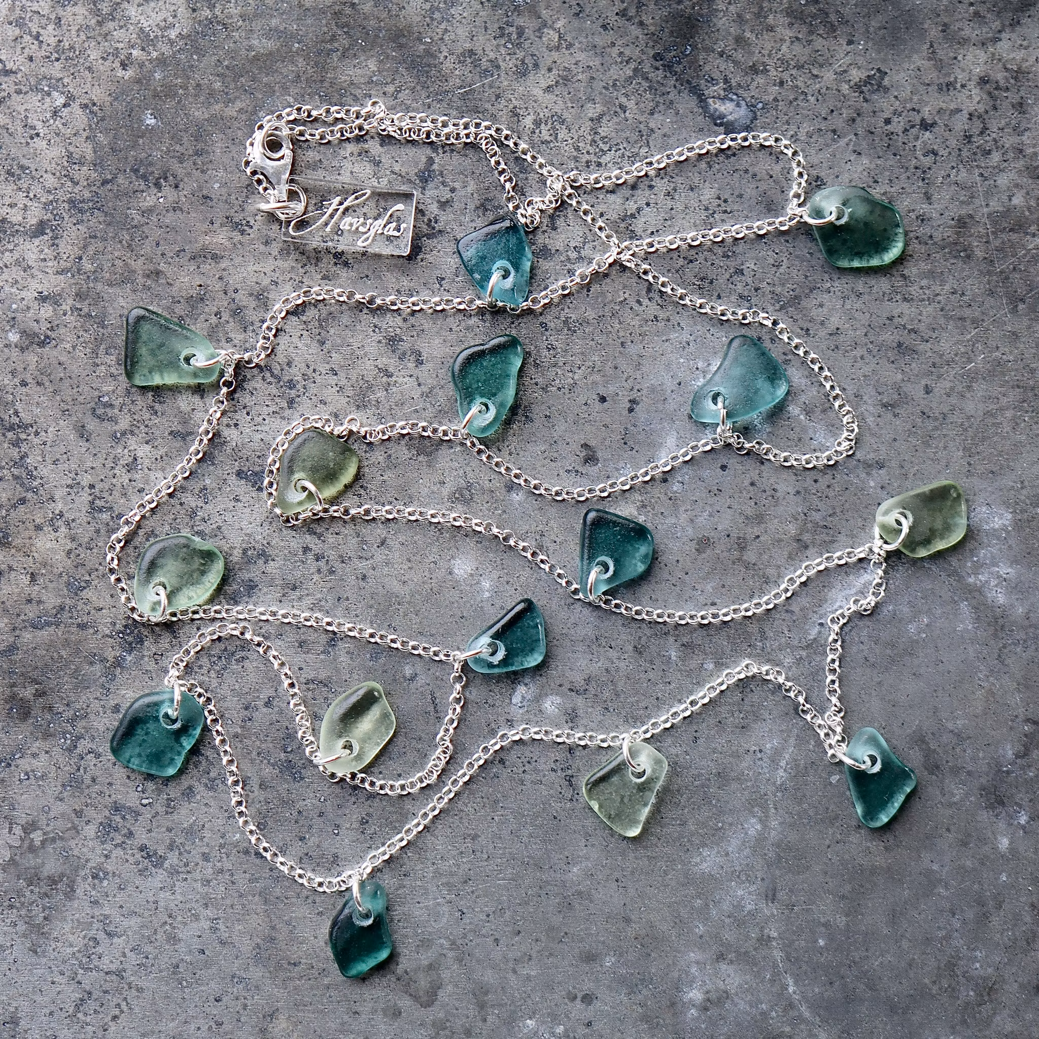 Femton matchande bitar i en 85 cm halskedja av äkta silver, i låset sitter en plexitag "Havsglas" tillverkad i Sverige.