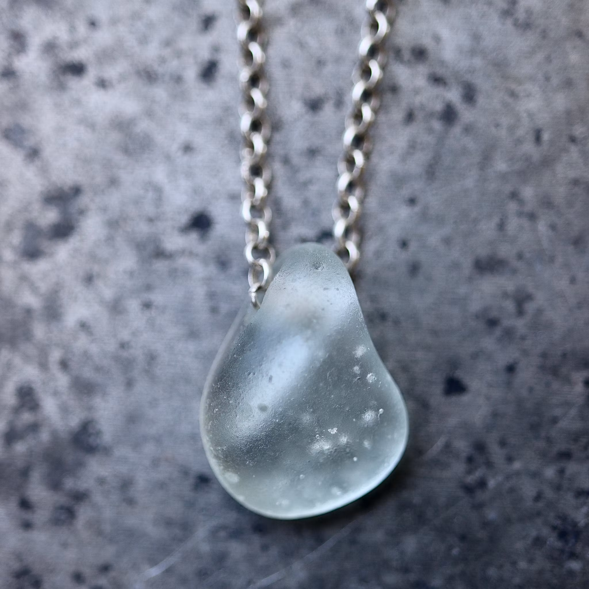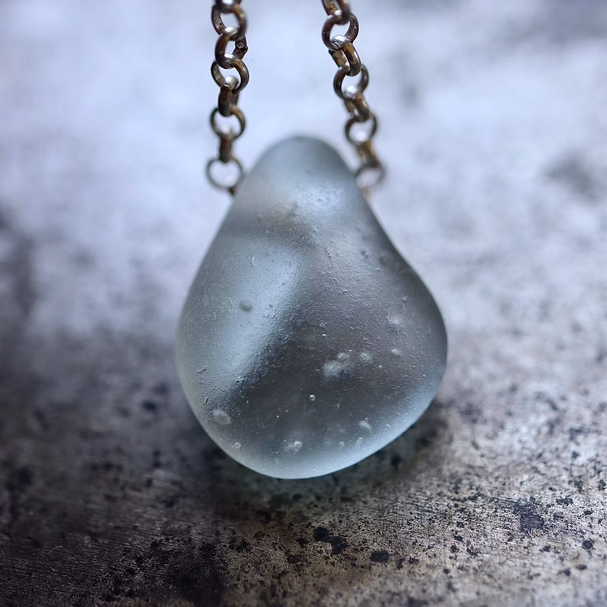 Havsglaset är samlat längs Skånes stränder och helt obearbetat, endast varsamt tvättat och borrat.