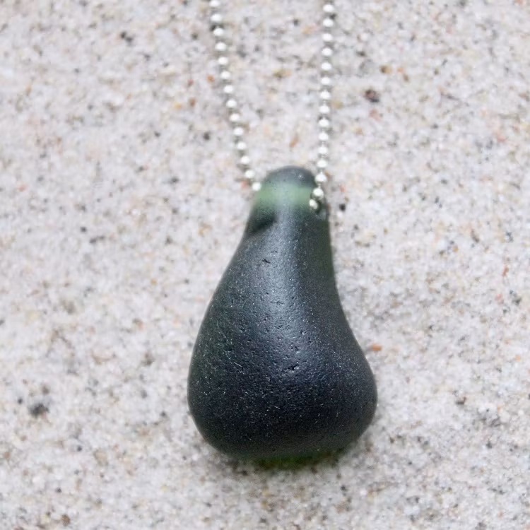 Havsglaset är samlat längs Skånes stränder och helt obearbetat, endast varsamt tvättat och borrat.