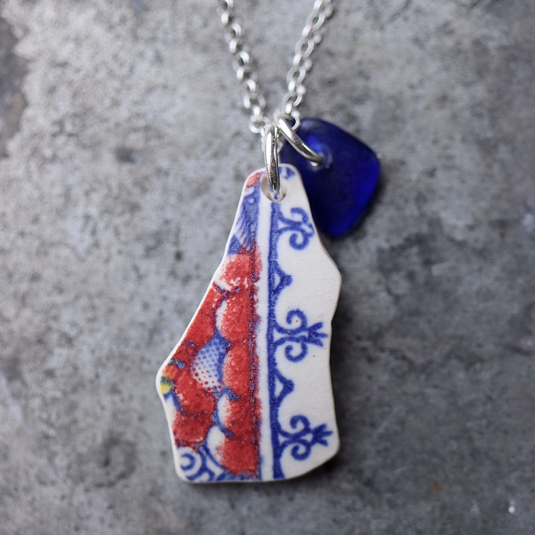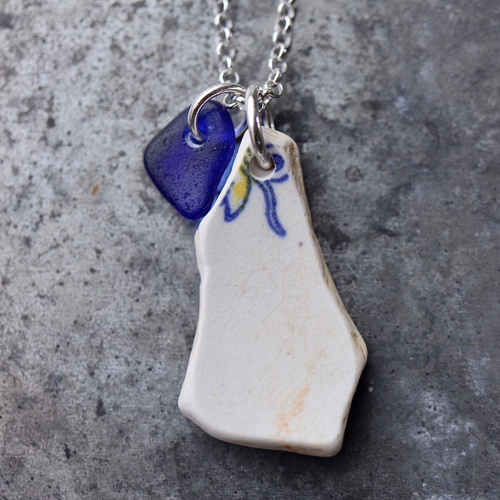 Havsglaset och havsporslinet är samlat längs Skånes stränder och helt obearbetat, endast varsamt tvättat och borrat.