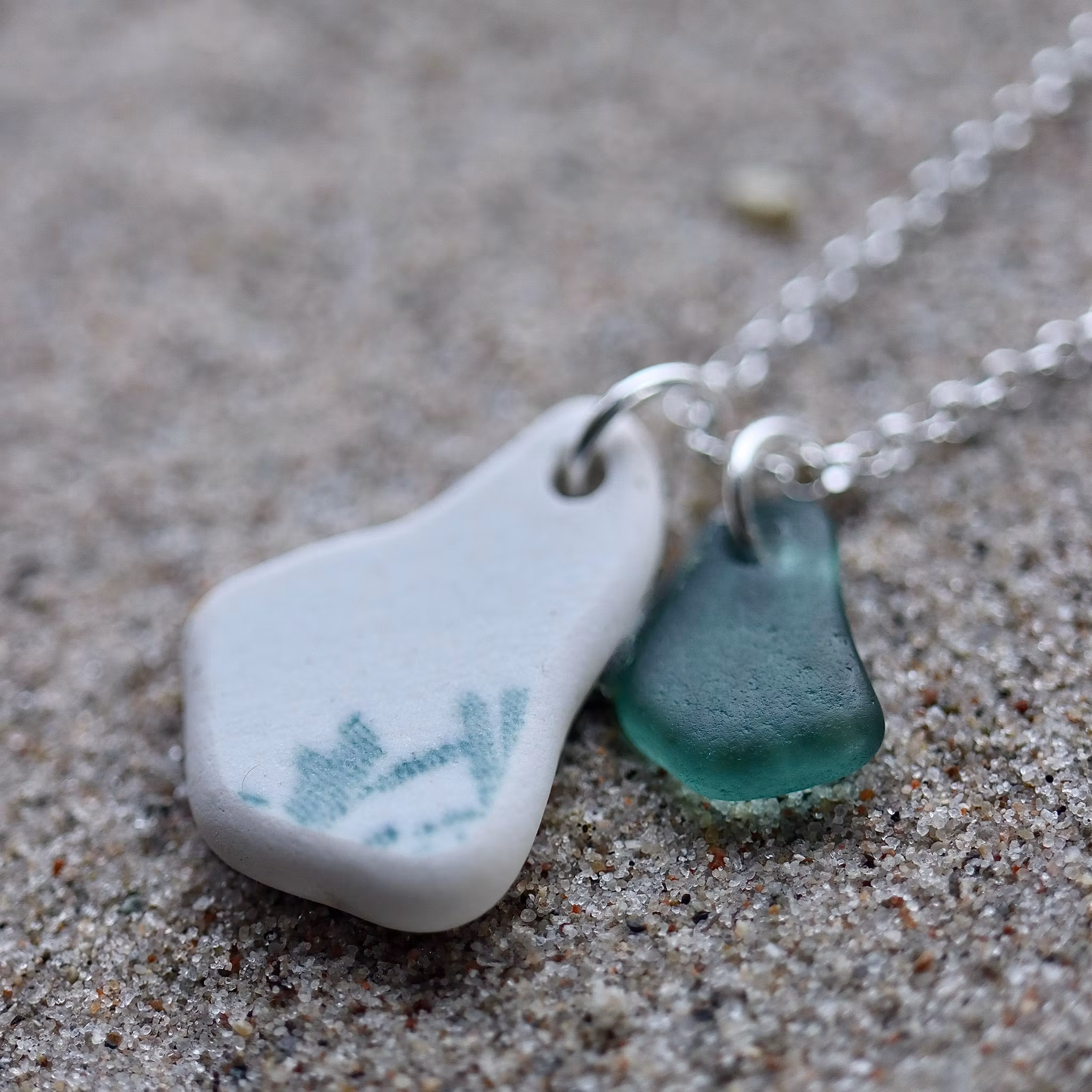 Havsglaset och havsporslinet är samlat längs Skånes stränder och helt obearbetat, endast varsamt tvättat och borrat.