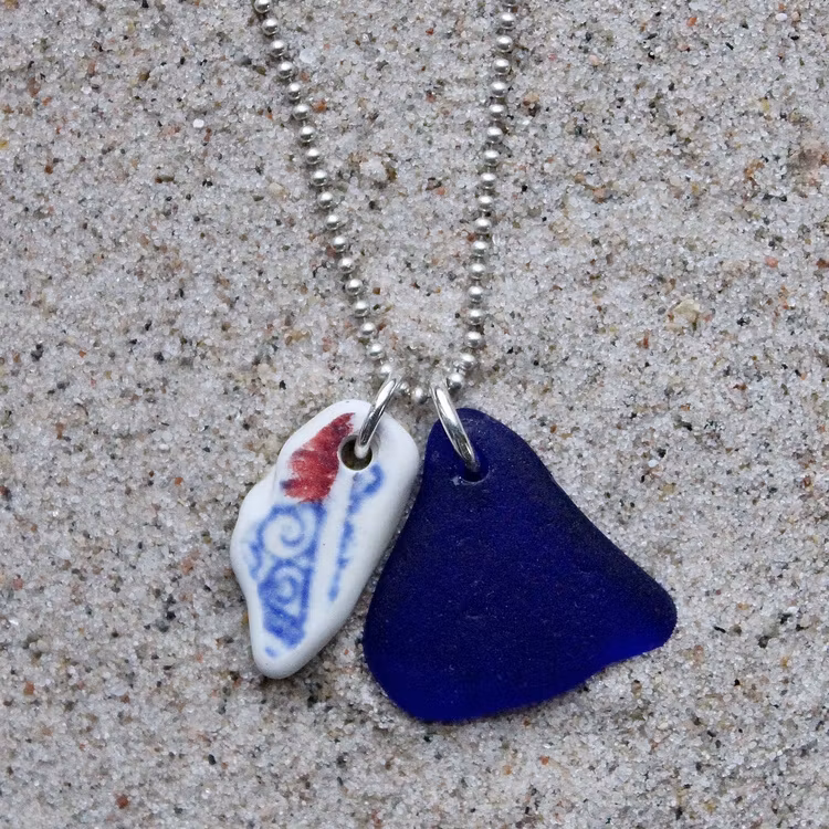 Havsglaset och havsporslinet är samlat längs Skånes stränder och helt obearbetat, endast varsamt tvättat och borrat.