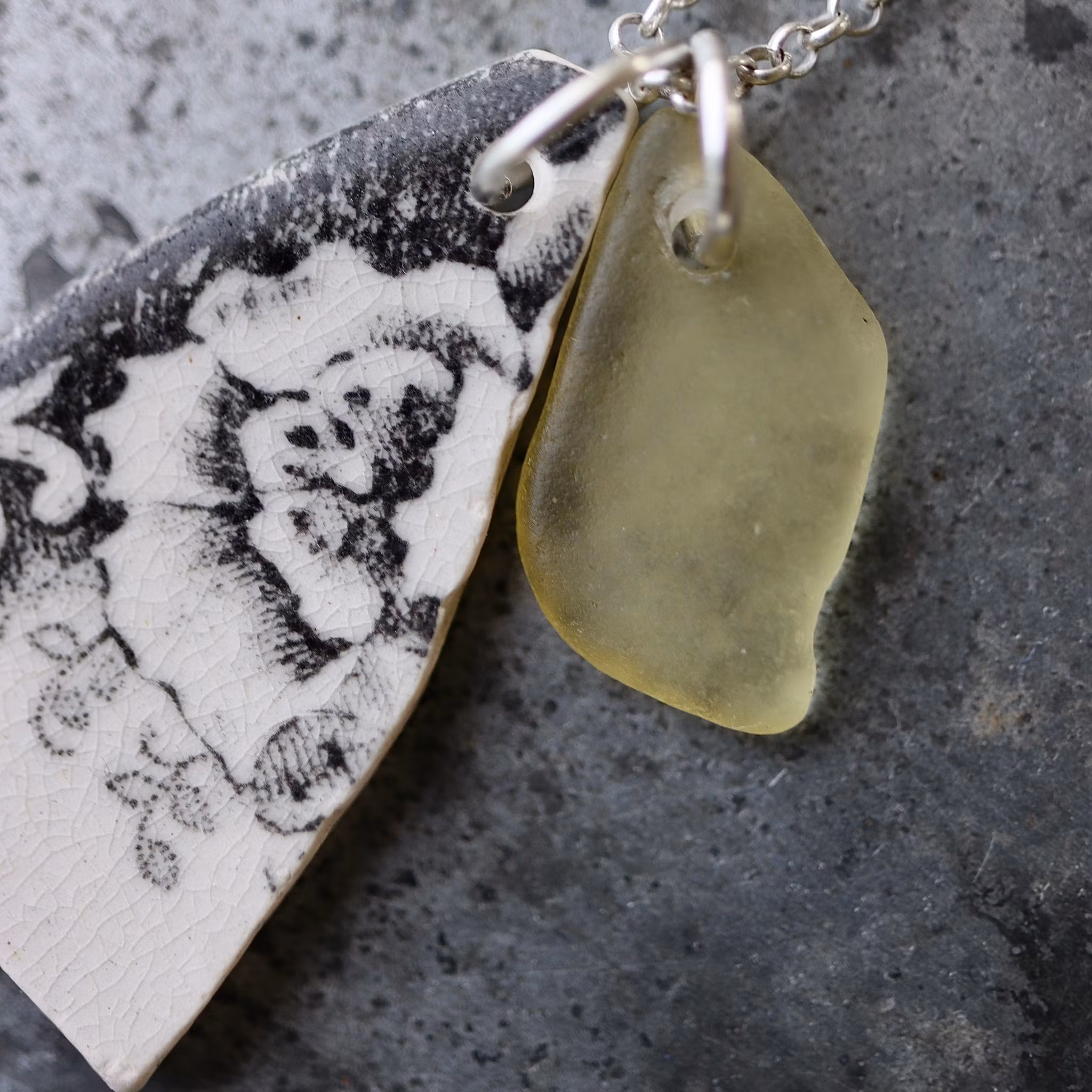 Havsglaset och havsporslinet är samlat längs Skånes stränder och helt obearbetat, endast varsamt tvättat och borrat.
