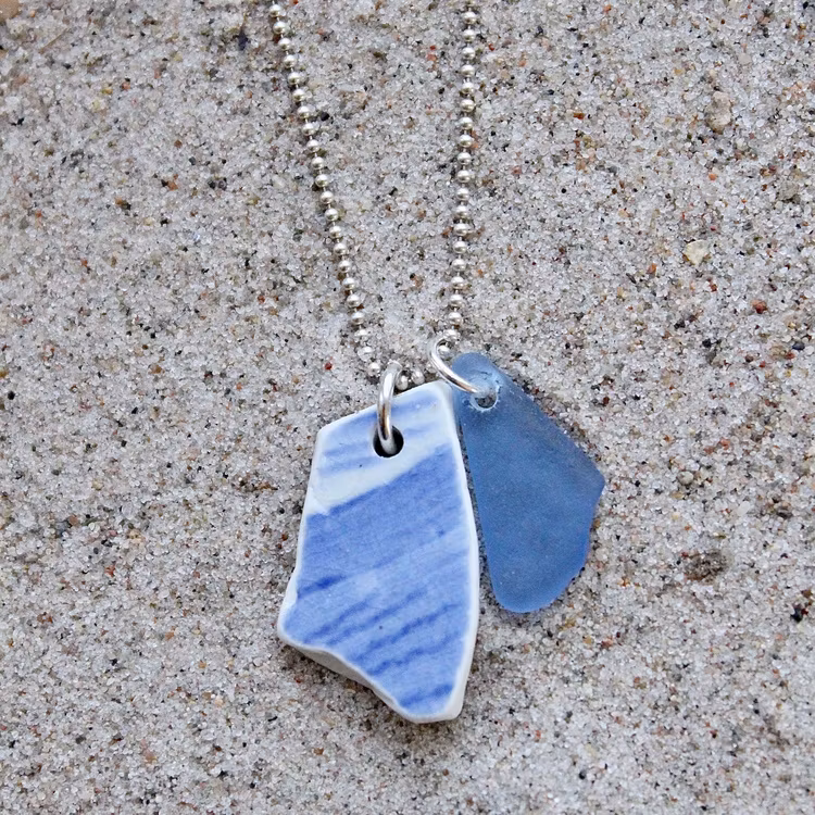 Havsglaset och havsporslinet är samlat längs Skånes stränder och helt obearbetat, endast varsamt tvättat och borrat.