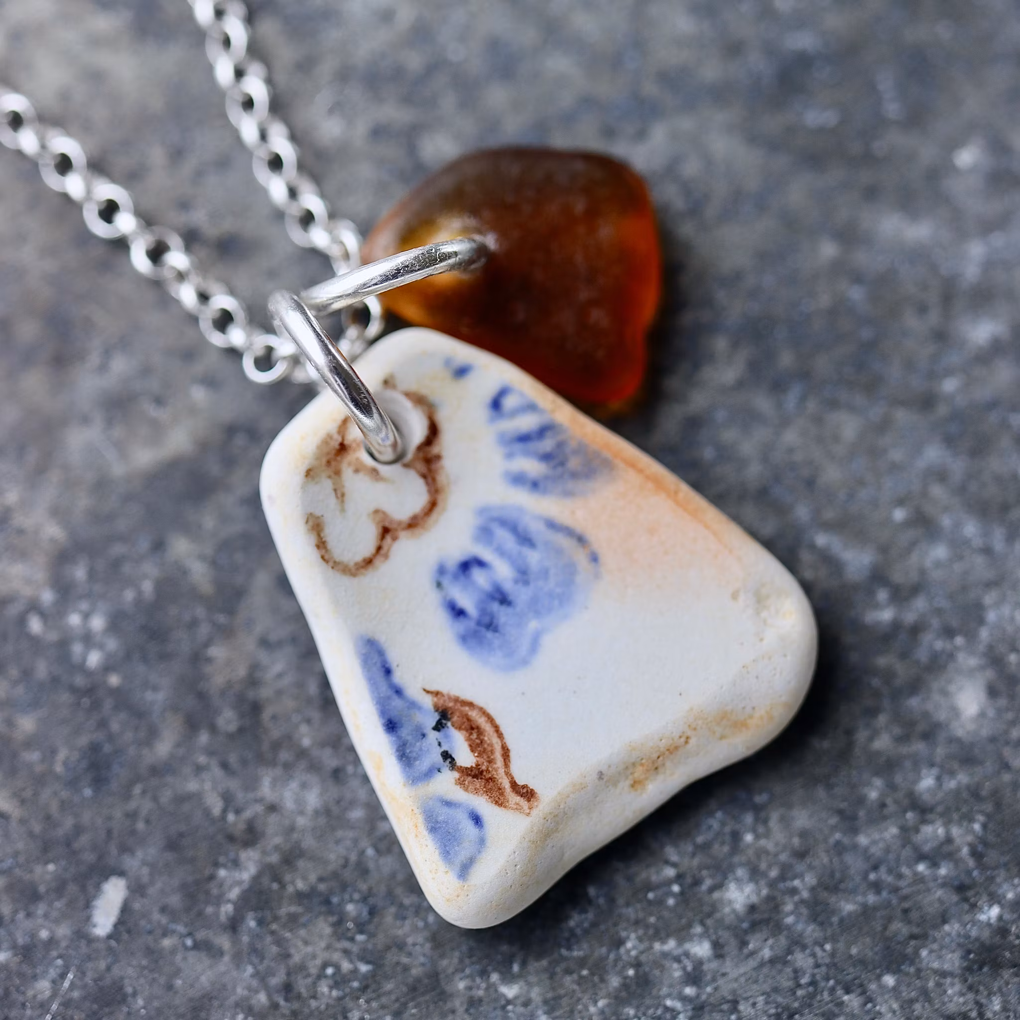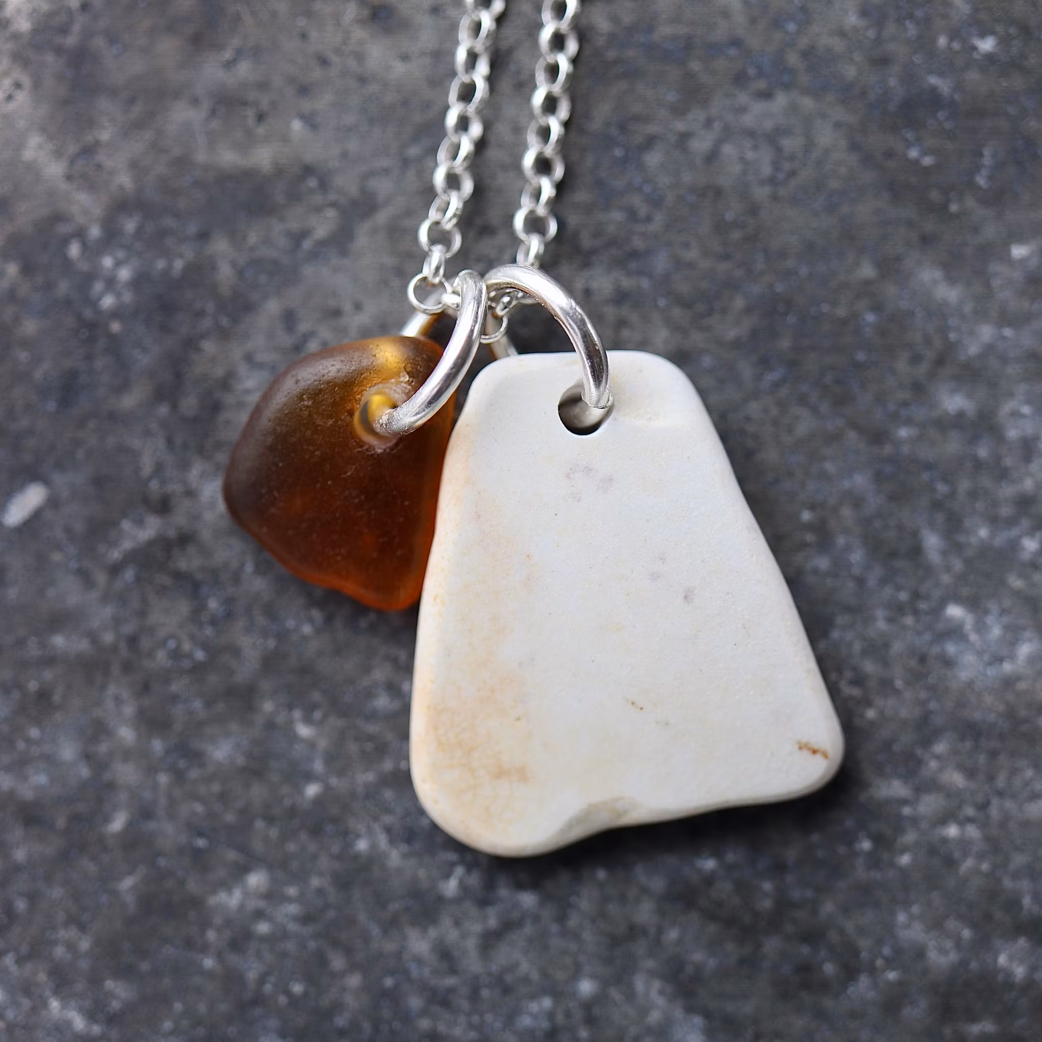 Havsglaset och havsporslinet är samlat längs Skånes stränder och helt obearbetat, endast varsamt tvättat och borrat.