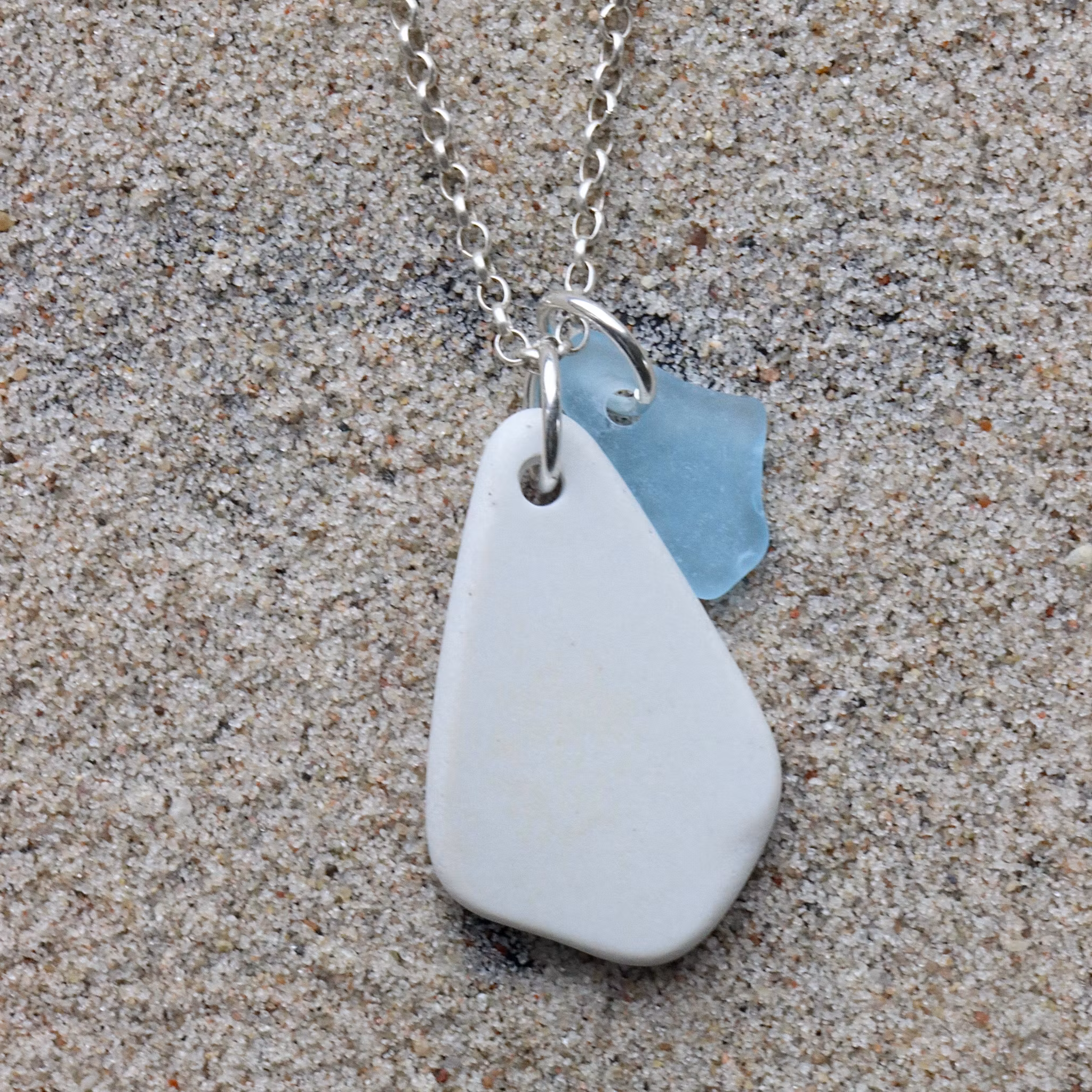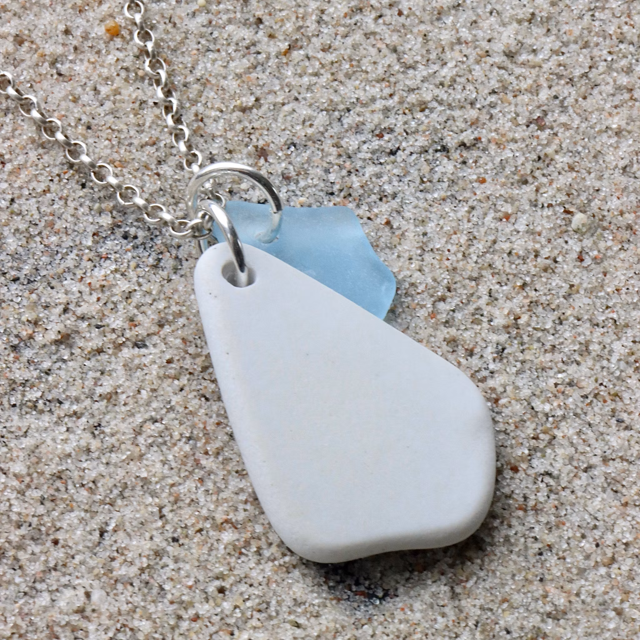 Havsglaset och havsporslinet är samlat längs Skånes stränder och helt obearbetat, endast varsamt tvättat och borrat.