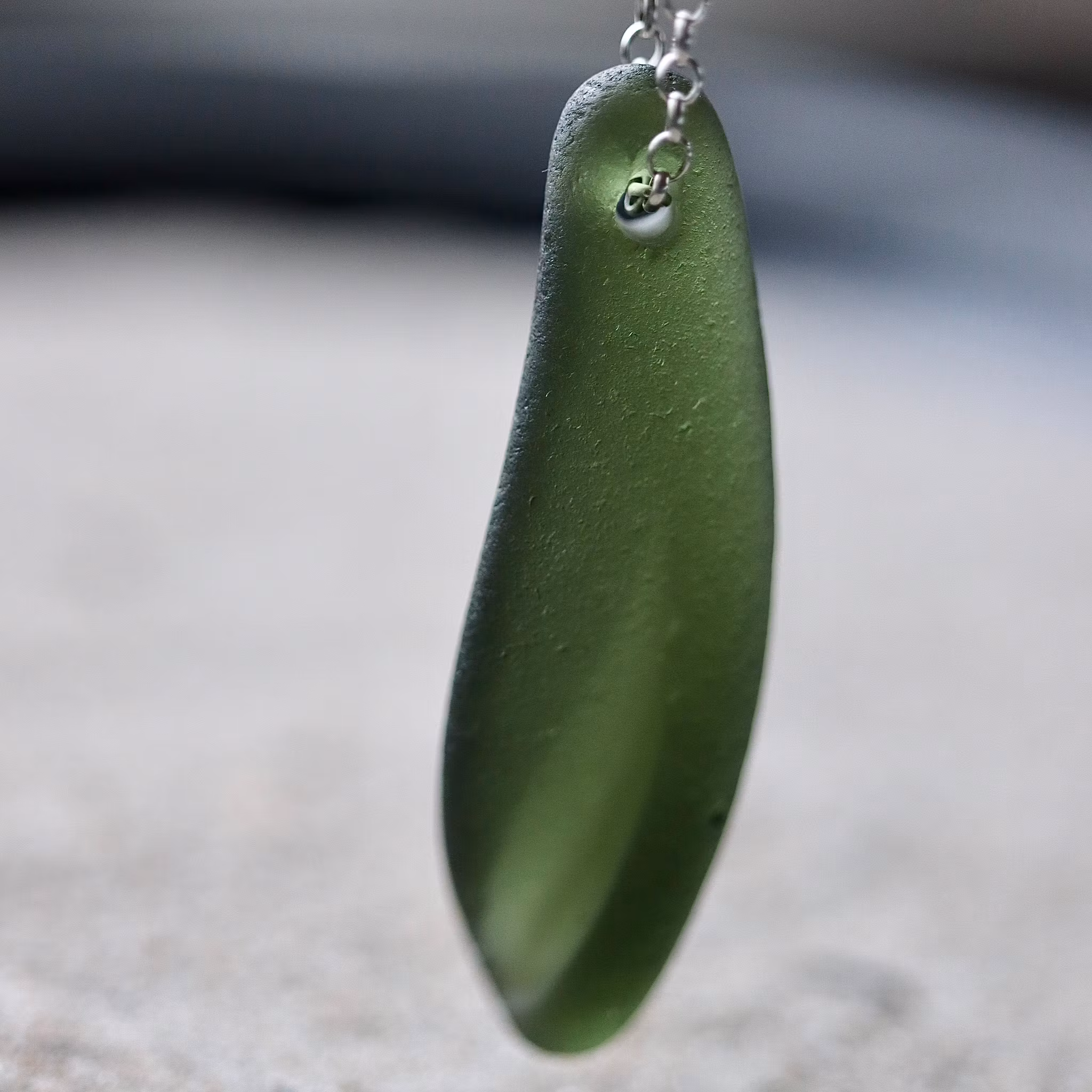 Havsglaset är samlat längs Skånes stränder och helt obearbetat, endast varsamt tvättat och borrat.