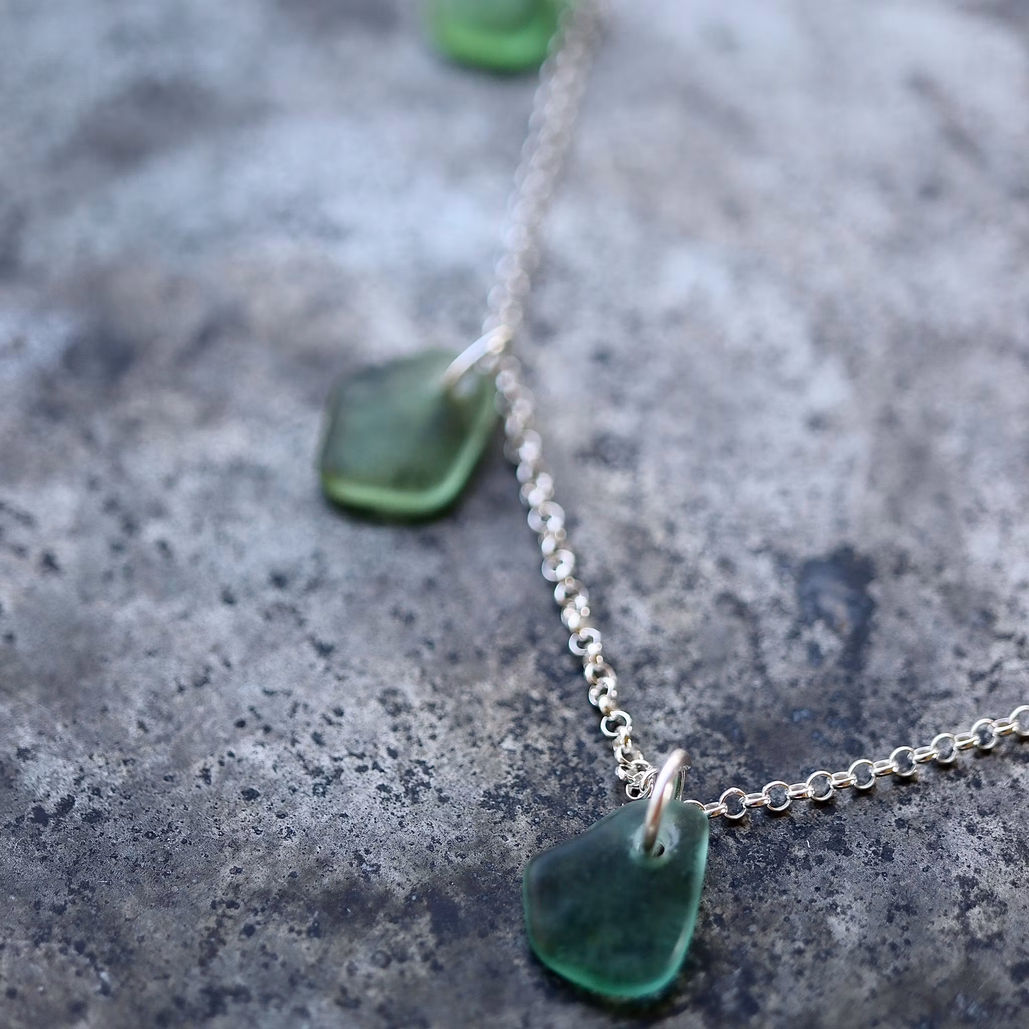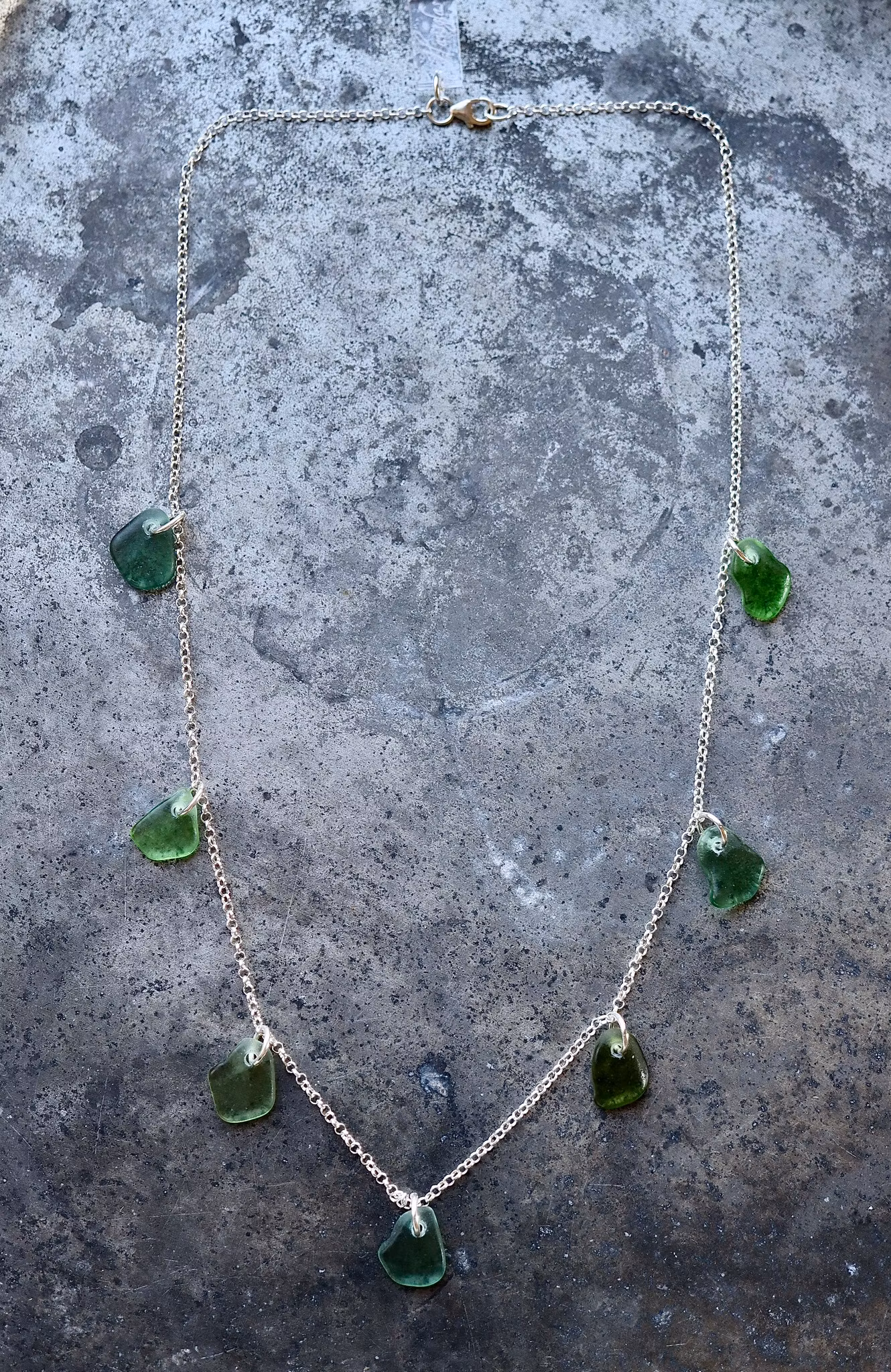 Sju matchande havsglas i en 50 cm halskedja av äkta silver, i låset sitter en plexitag "Havsglas" tillverkad i Sverige.
