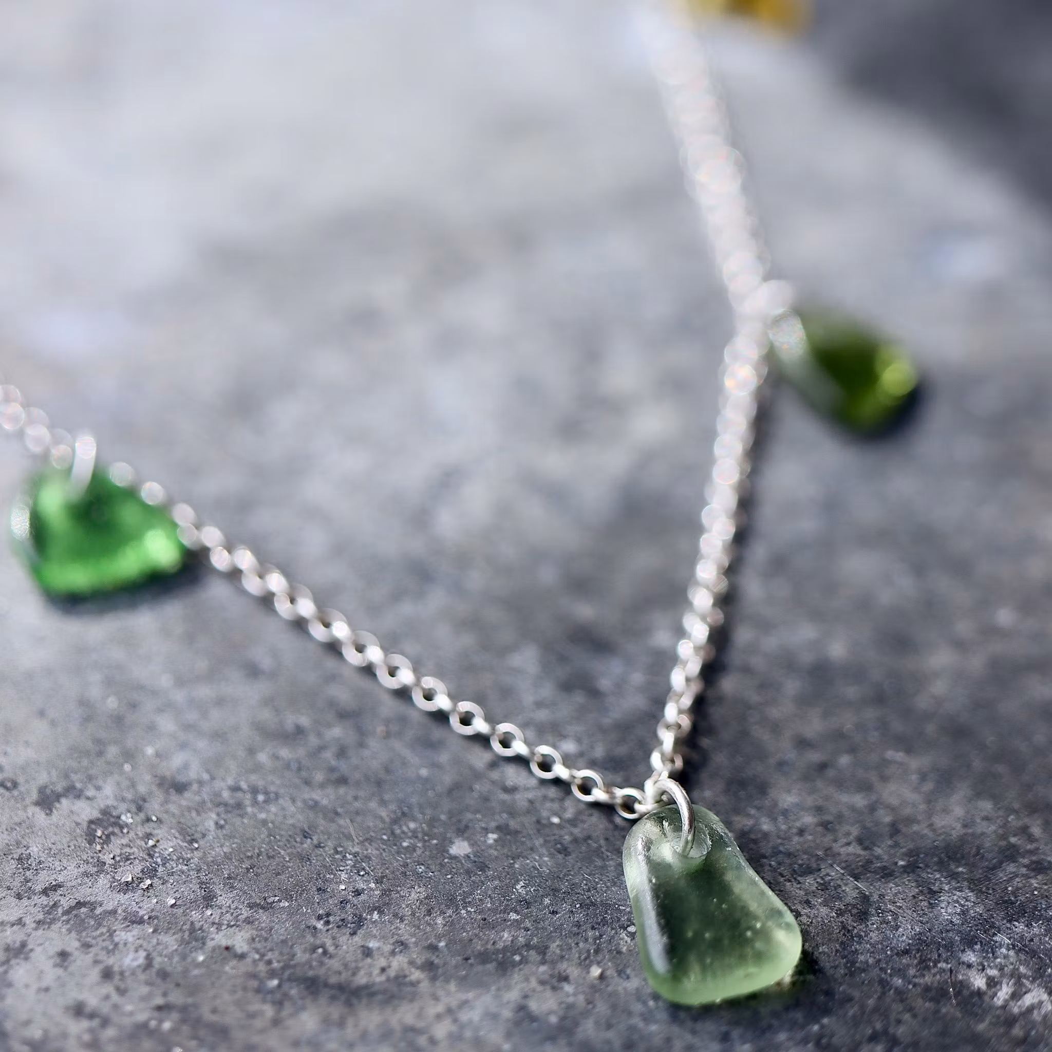 Sju matchande havsglas i en 50 cm halskedja av äkta silver, i låset sitter en plexitag "Havsglas" tillverkad i Sverige.