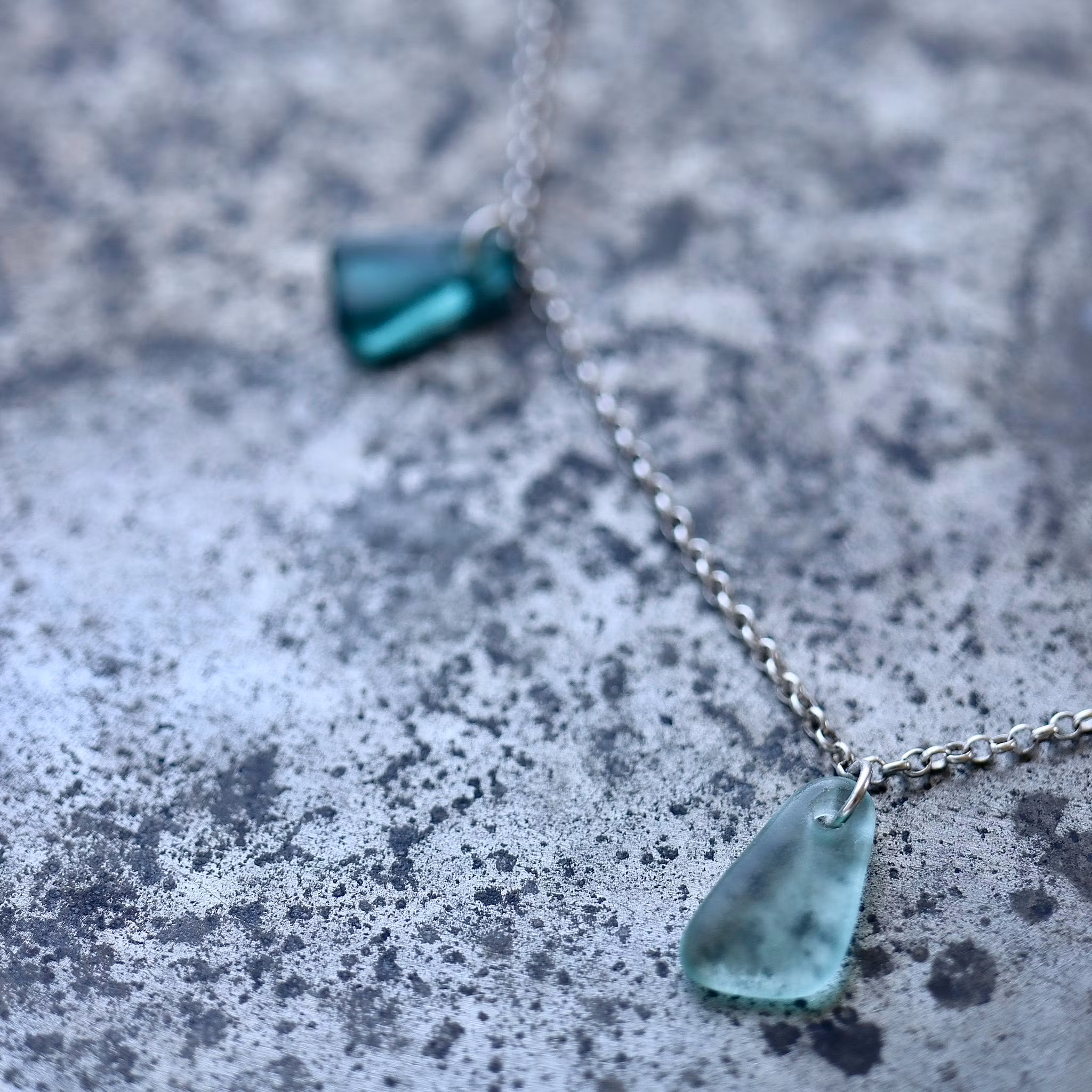 Sju matchande havsglas i en 50 cm halskedja av äkta silver, i låset sitter en plexitag "Havsglas" tillverkad i Sverige.