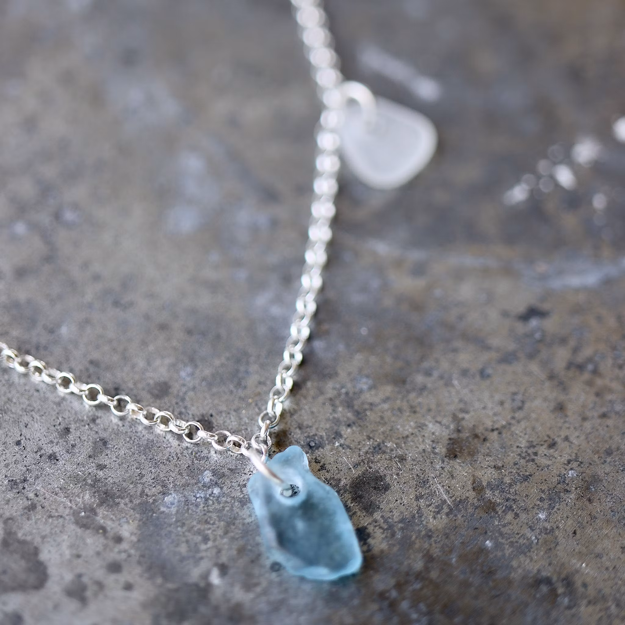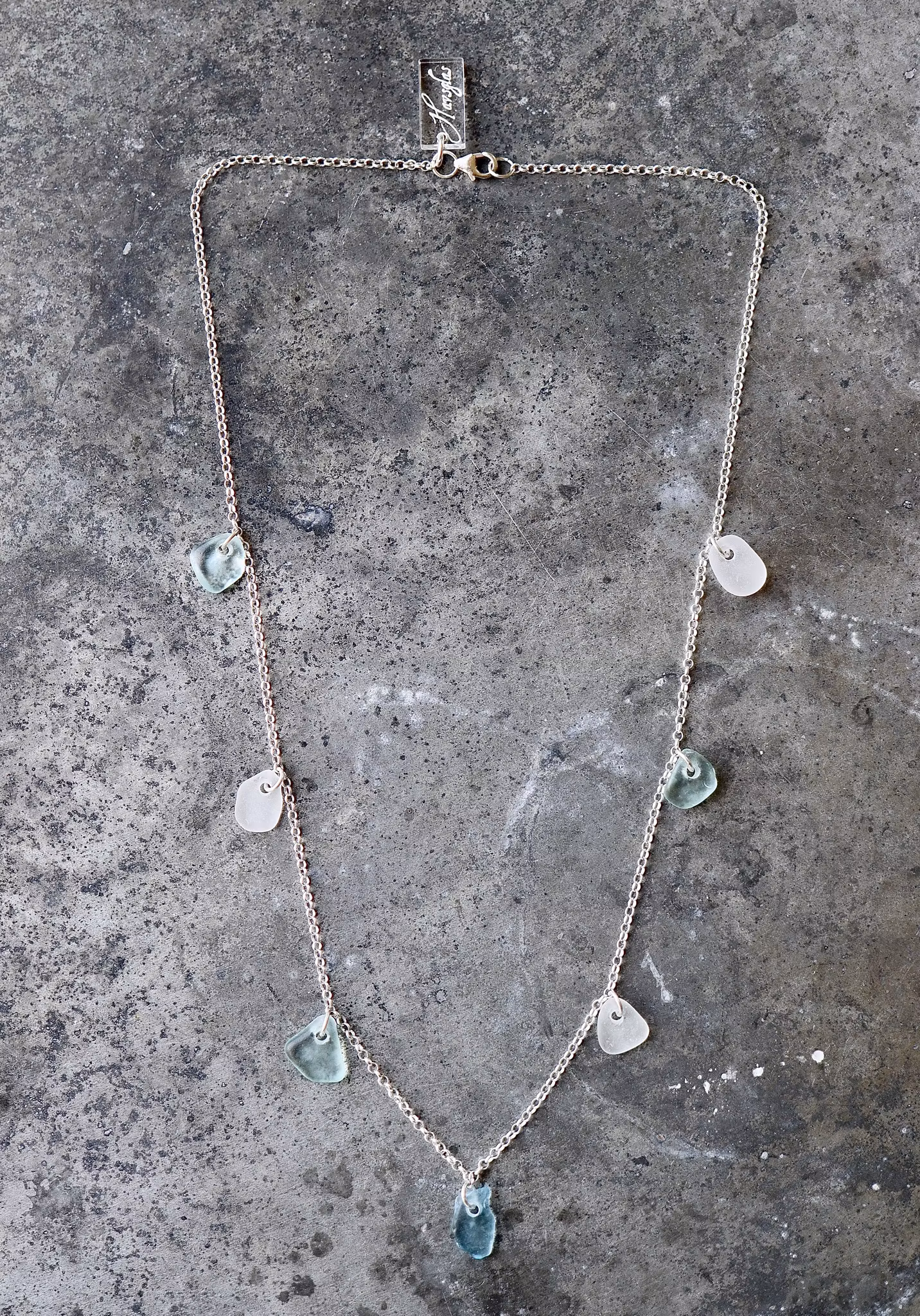 Sju matchande havsglas i en 50 cm halskedja av äkta silver, i låset sitter en plexitag "Havsglas" tillverkad i Sverige.