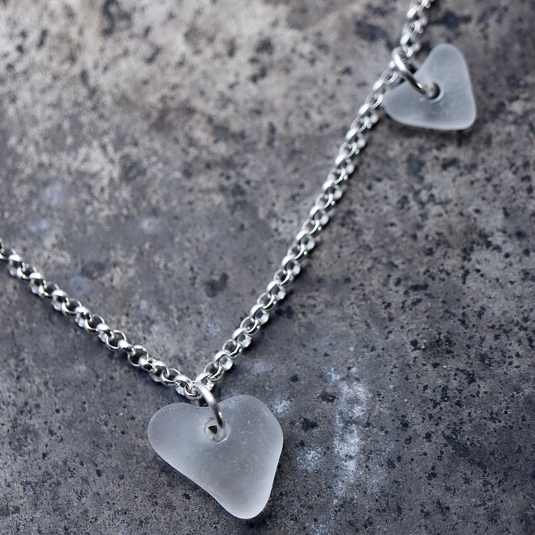 Havsglaset är samlat längs Skånes stränder och helt obearbetat, endast varsamt tvättat och borrat.