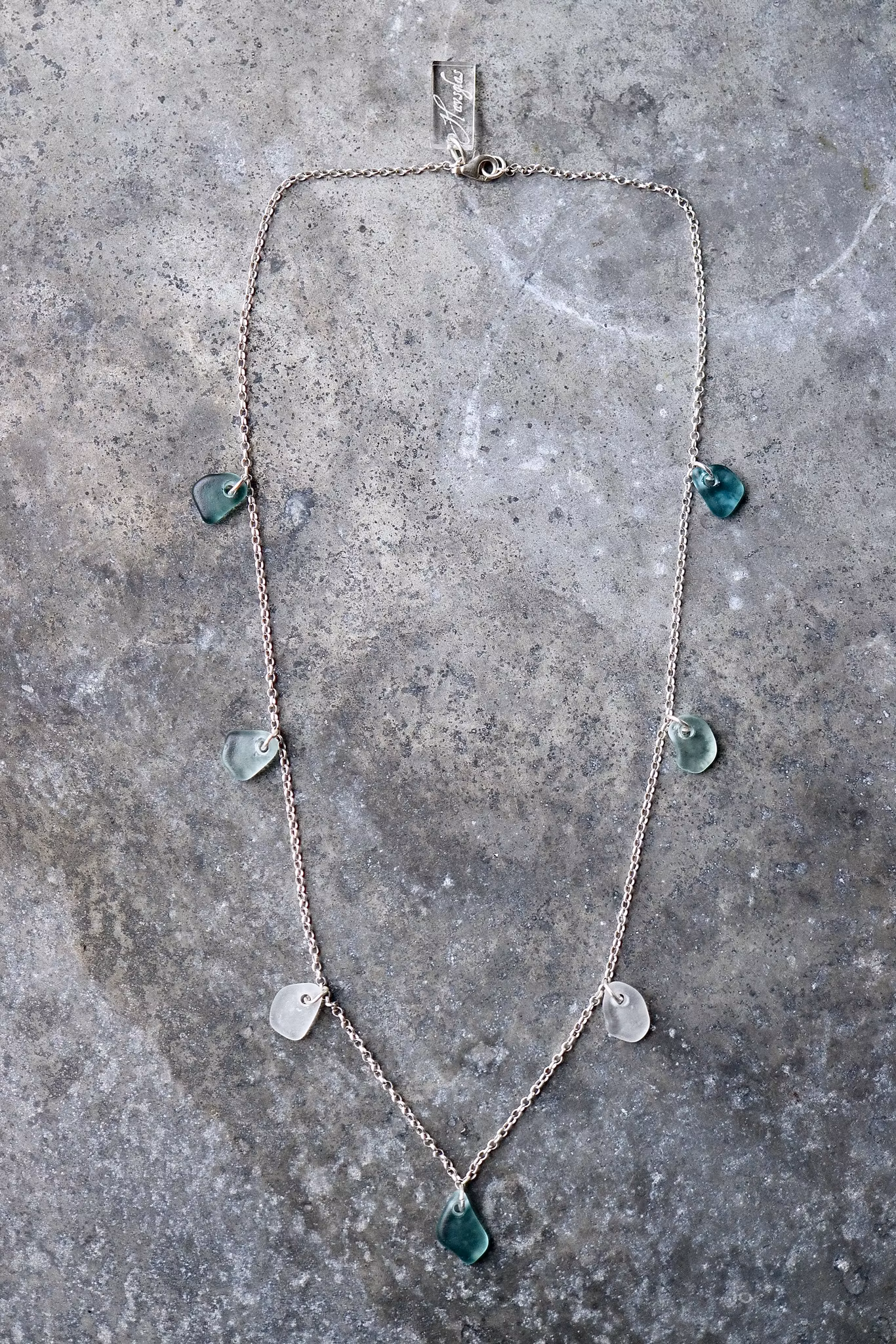 Sju matchande havsglas i en 50 cm halskedja av äkta silver, i låset sitter en plexitag "Havsglas" tillverkad i Sverige.