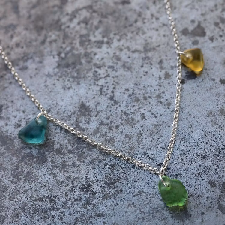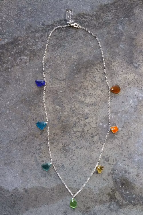 Sju matchande havsglas i en 50 cm halskedja av äkta silver, i låset sitter en plexitag "Havsglas" tillverkad i Sverige.