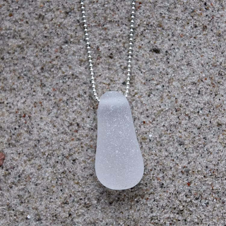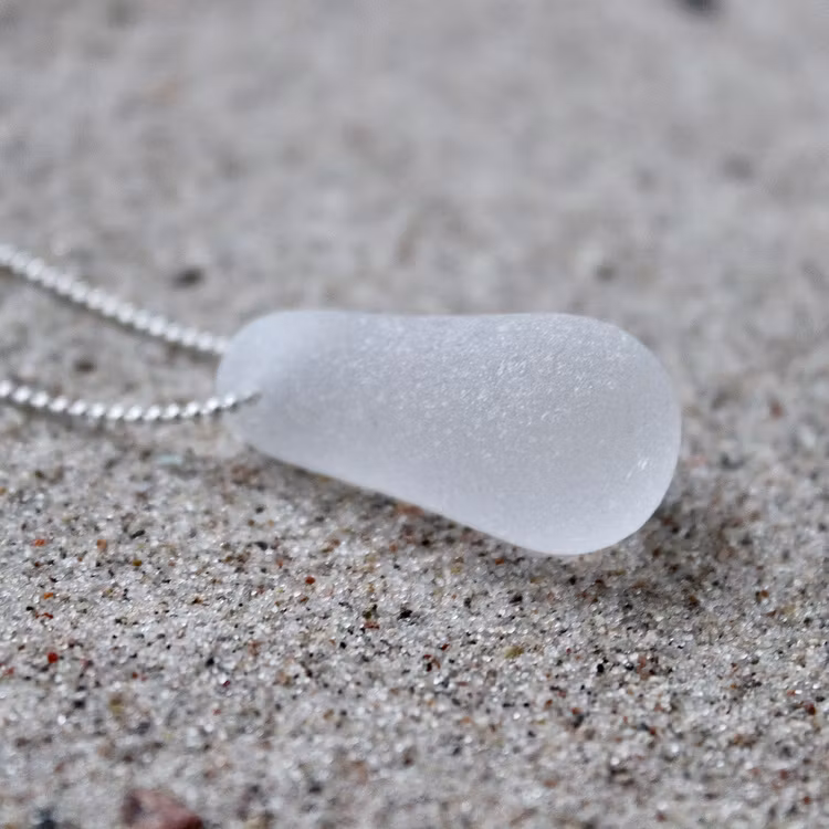 Havsglaset är samlat längs Skånes stränder och helt obearbetat, endast varsamt tvättat och borrat.
