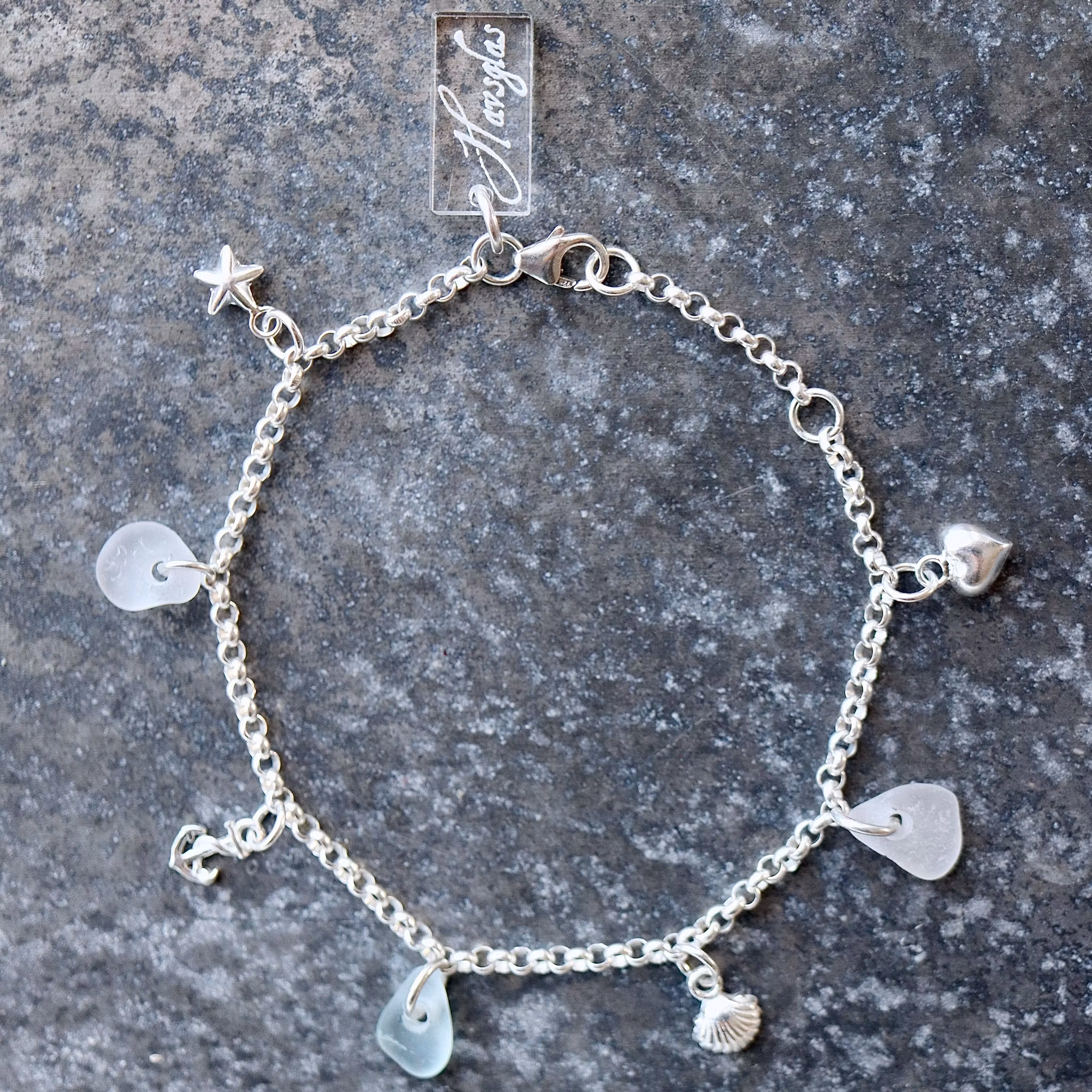 Tre matchande havsglas och fyra berlocker av äkta silver i kedja av äkta silver, justerbart till 17 eller 19 cm.