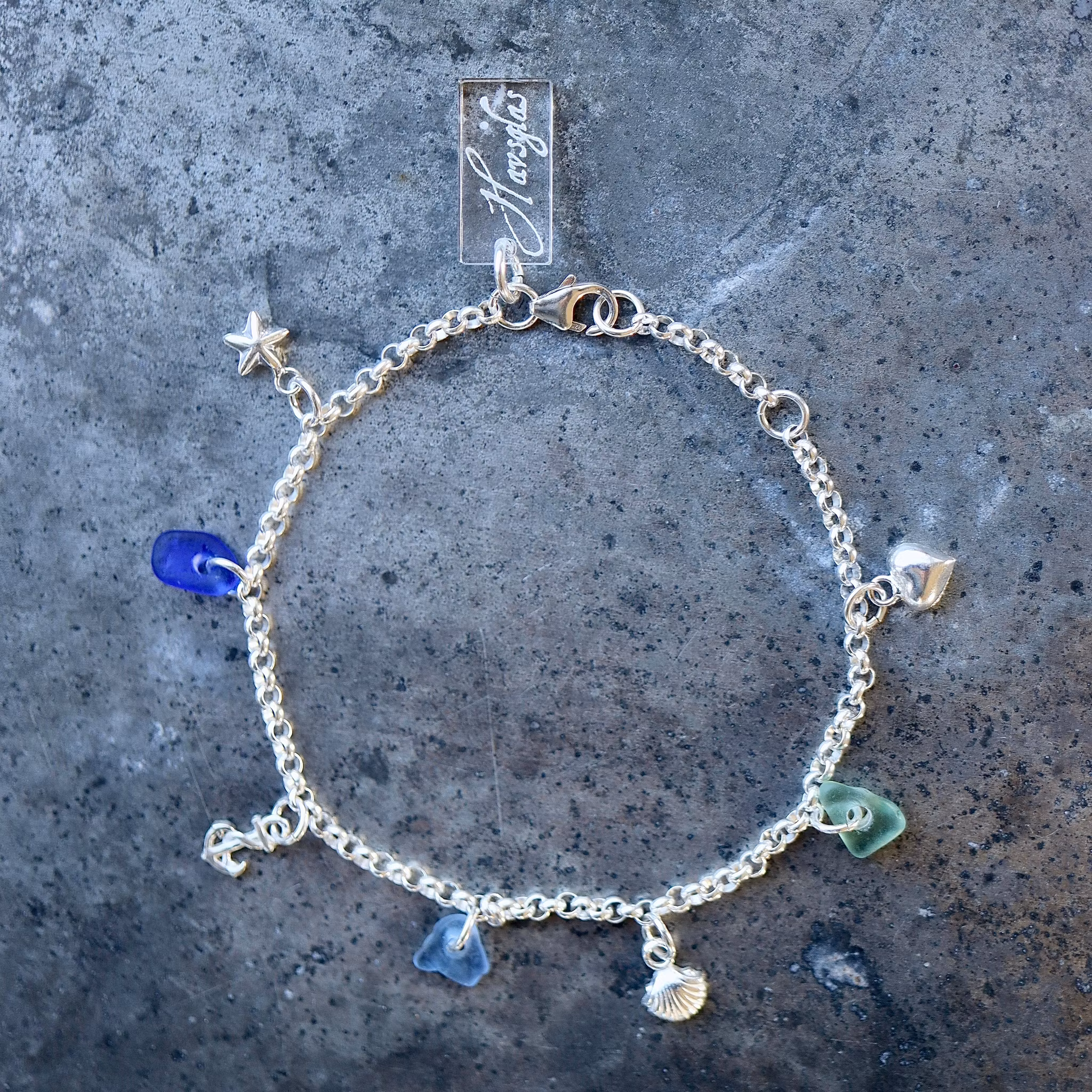 Tre matchande havsglas och fyra berlocker av äkta silver i kedja av äkta silver, justerbart till 17 eller 19 cm.