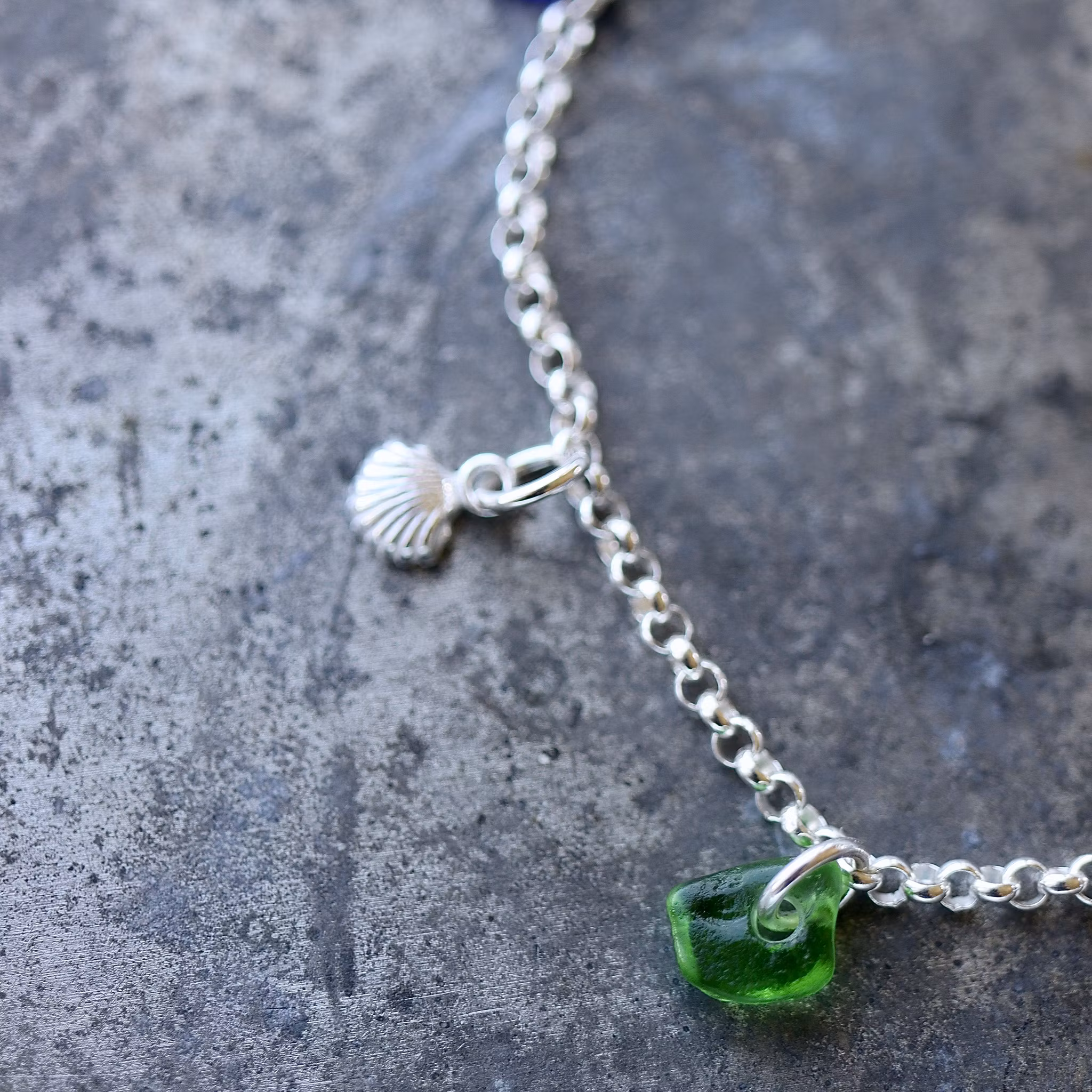 Tre matchande havsglas och tre berlocker av äkta silver i kedja av äkta silver, justerbart till 17 eller 19 cm.