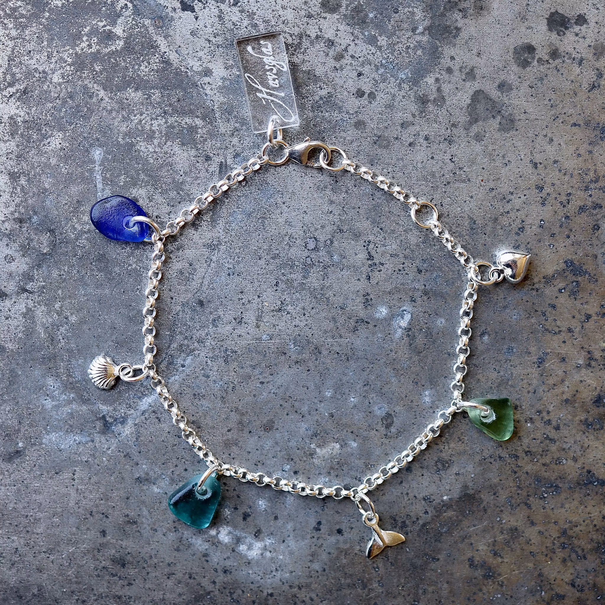 Tre matchande havsglas och tre berlocker av äkta silver i kedja av äkta silver, justerbart till 17 eller 19 cm.