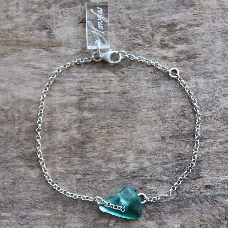 Kedja av äkta silver, justerbart till 17 eller 19 cm, i låset sitter en plexitag "Havsglas" tillverkad i Sverige.