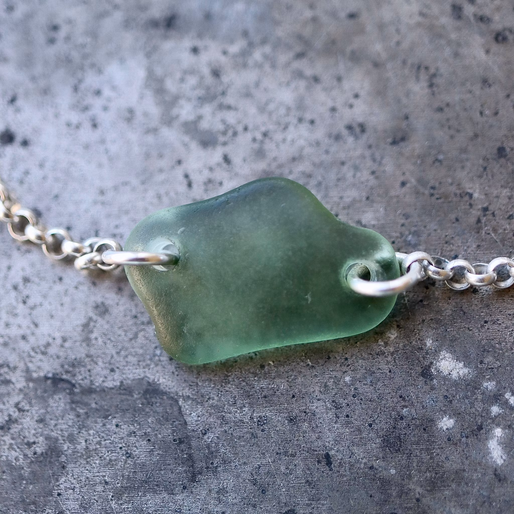 Kedja av äkta silver, justerbart till 17 eller 19 cm, i låset sitter en plexitag "Havsglas" tillverkad i Sverige.