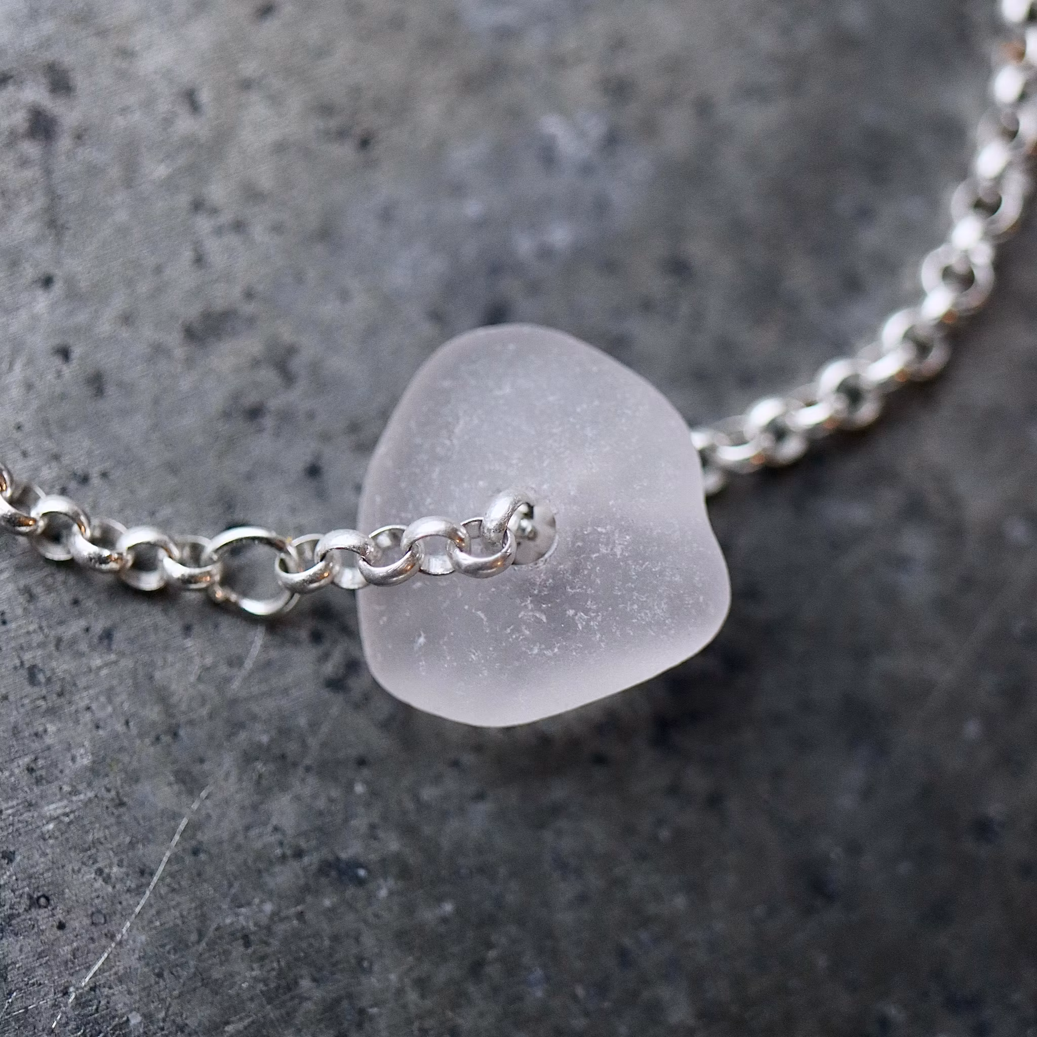Kedja av äkta silver, justerbart till 17 eller 19 cm, i låset sitter en plexitag "Havsglas" tillverkad i Sverige.