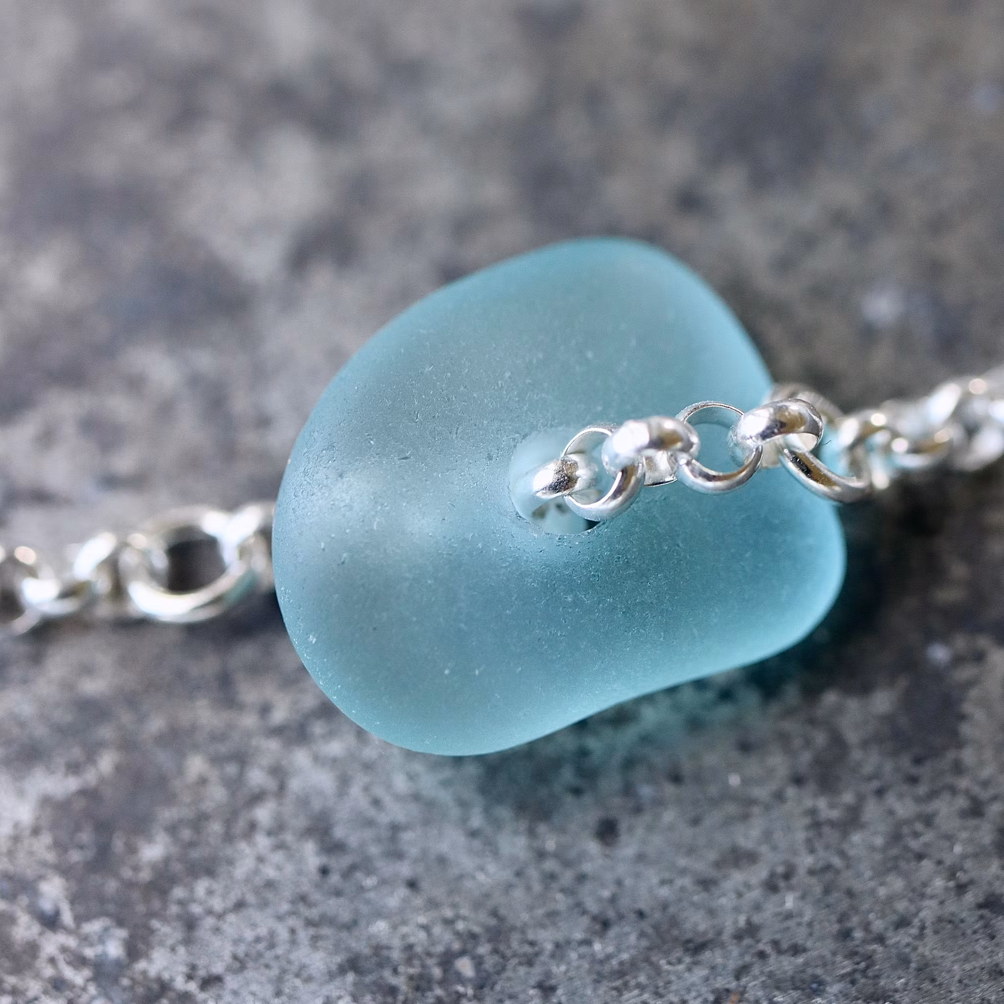 Kedja av äkta silver, justerbart till 17 eller 19 cm, i låset sitter en plexitag "Havsglas" tillverkad i Sverige.