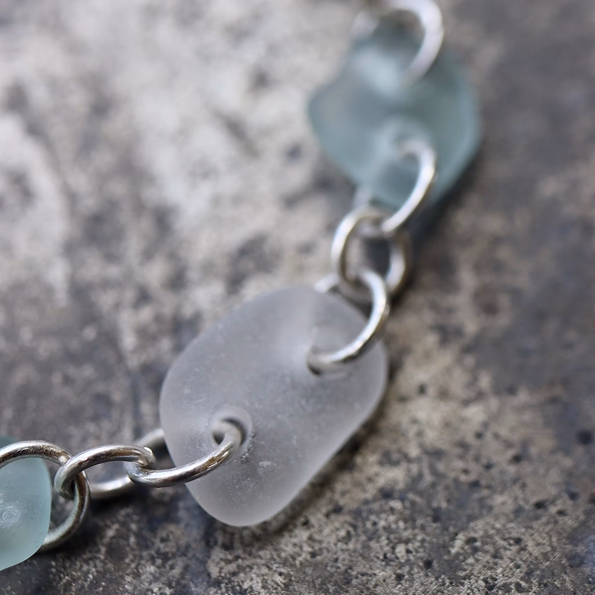 Sju matchande havsglas sammanlänkade av äkta silver, justerbart till 18 eller 20 cm.