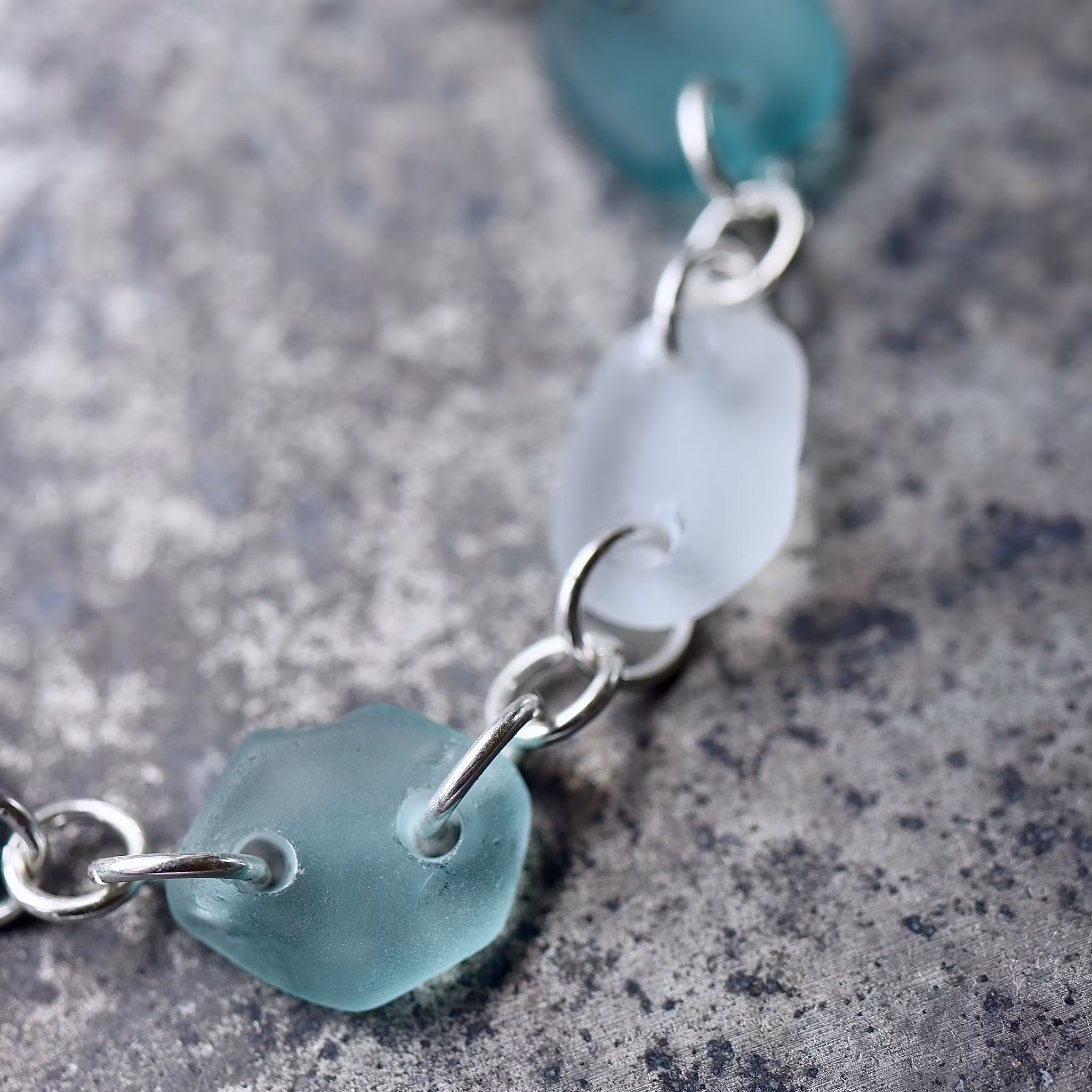 Sju matchande havsglas sammanlänkade av äkta silver, justerbart till 18 eller 20 cm.