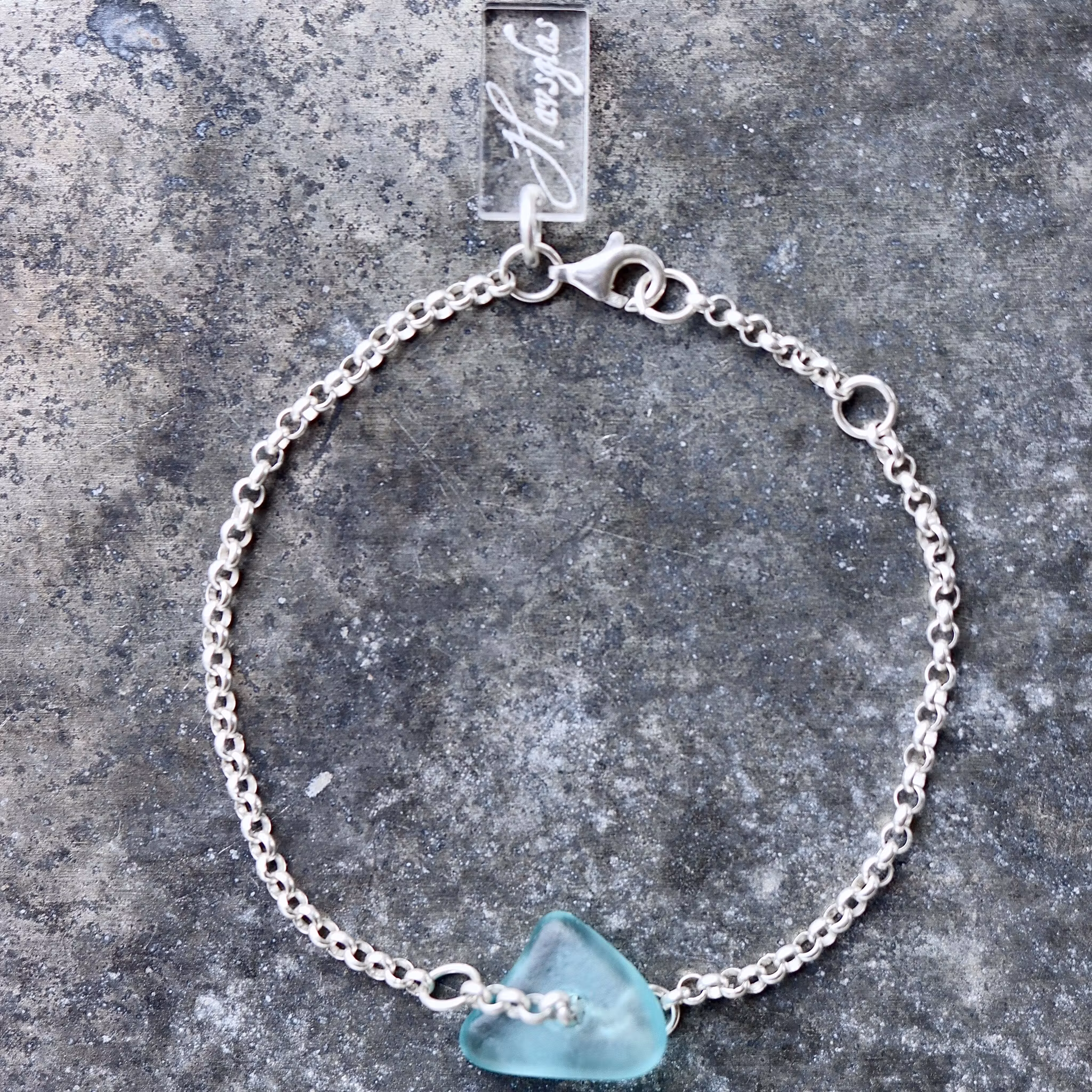 Kedja av äkta silver, justerbart till 17 eller 19 cm, i låset sitter en plexitag "Havsglas" tillverkad i Sverige.