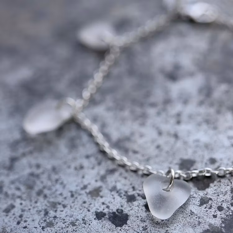 Fem matchande havsglas i kedja av äkta silver, justerbart till 17 eller 19 cm.