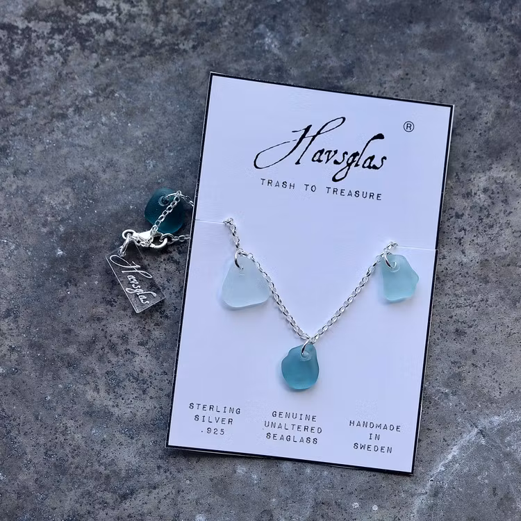 Havsglaset är samlat längs Skånes stränder och helt obearbetat, endast varsamt tvättat och borrat.