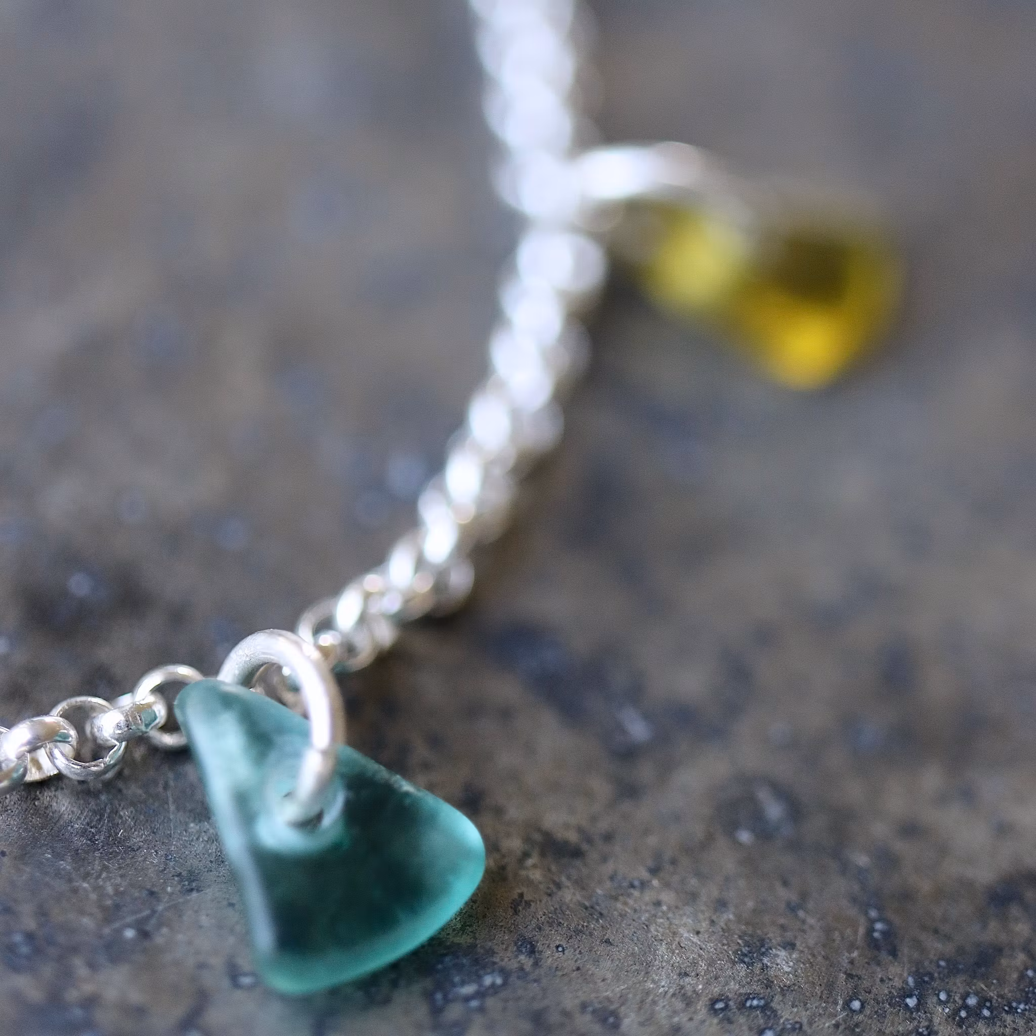 Fem matchande havsglas i kedja av äkta silver, justerbart till 17 eller 19 cm.