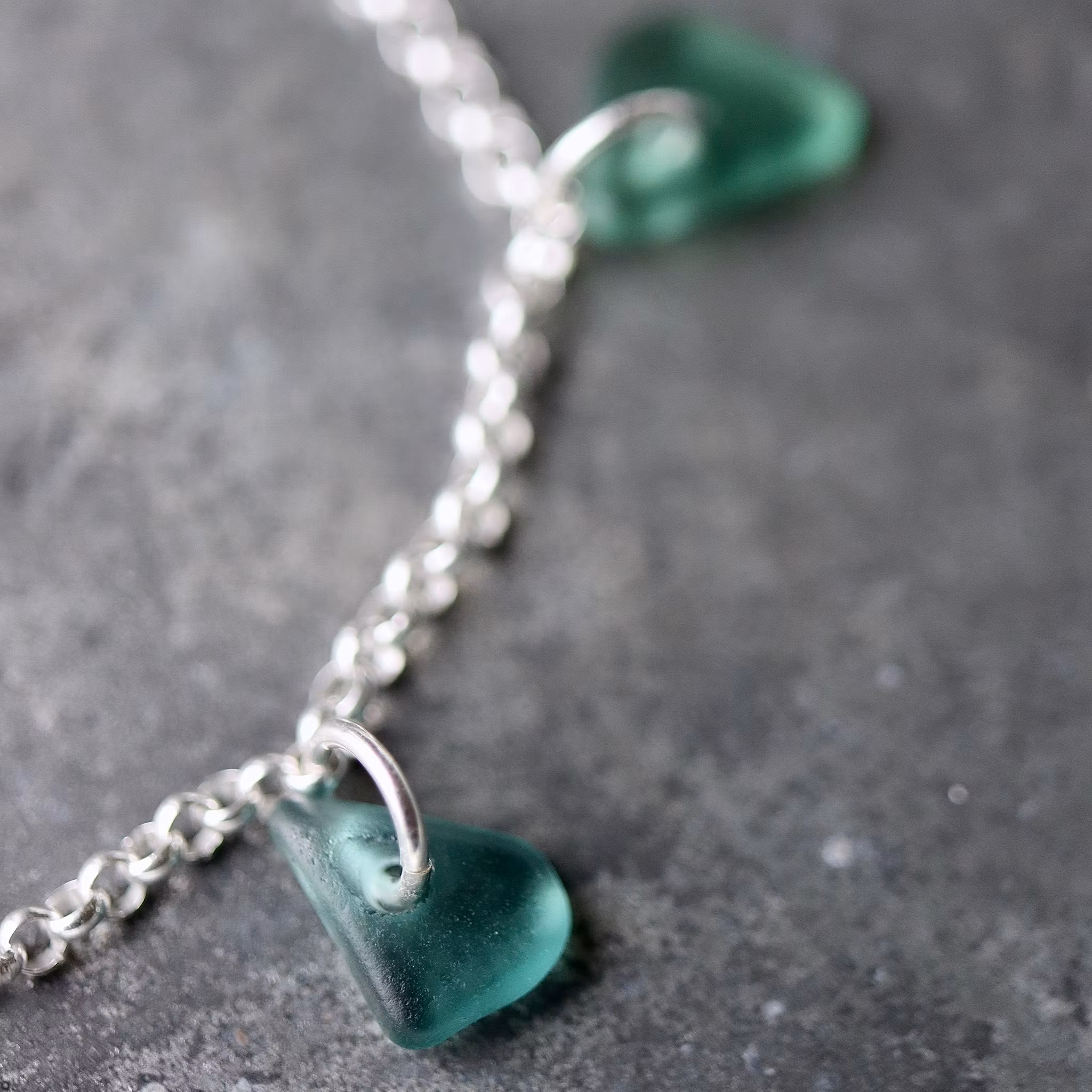 Fem matchande havsglas i kedja av äkta silver, justerbart till 17 eller 19 cm.
