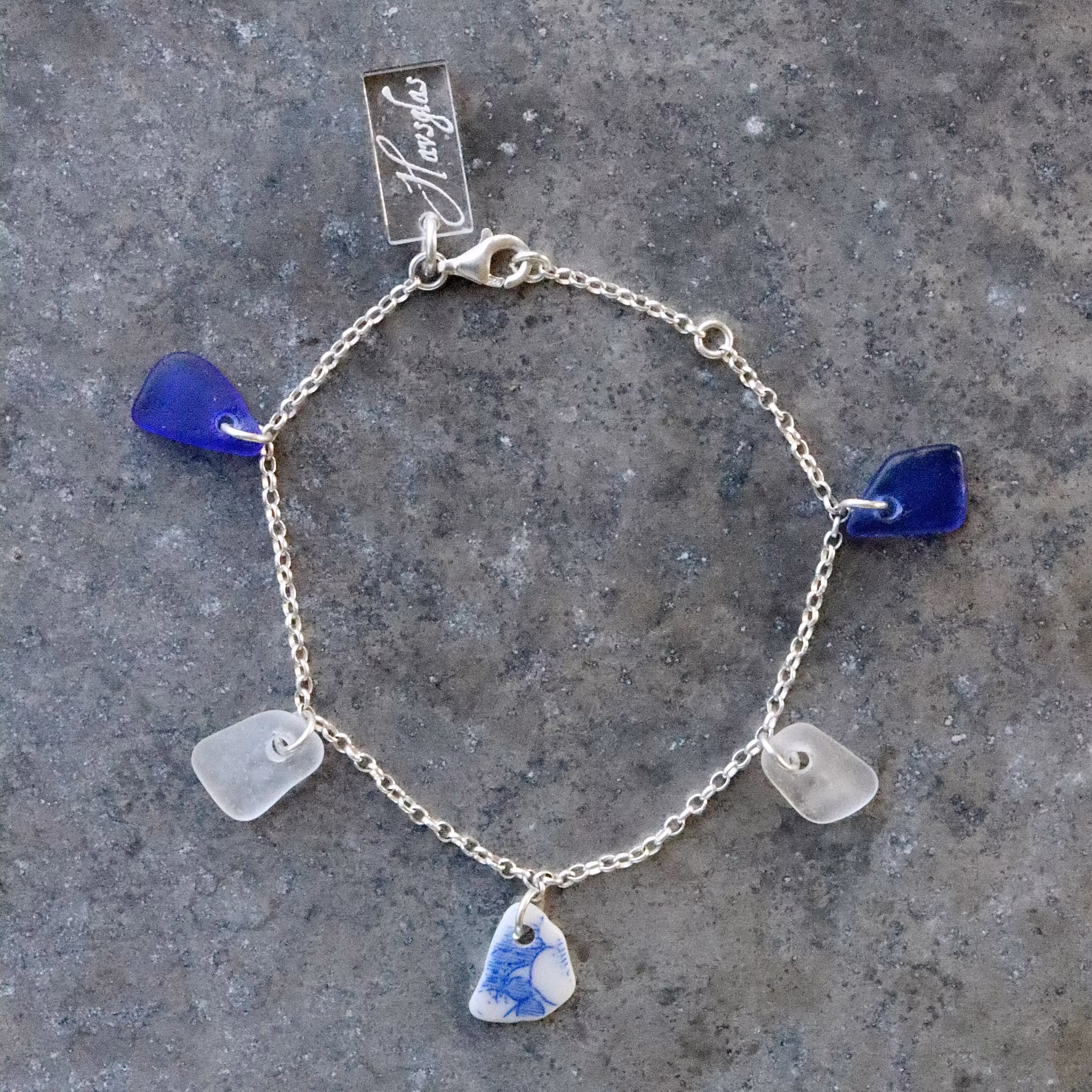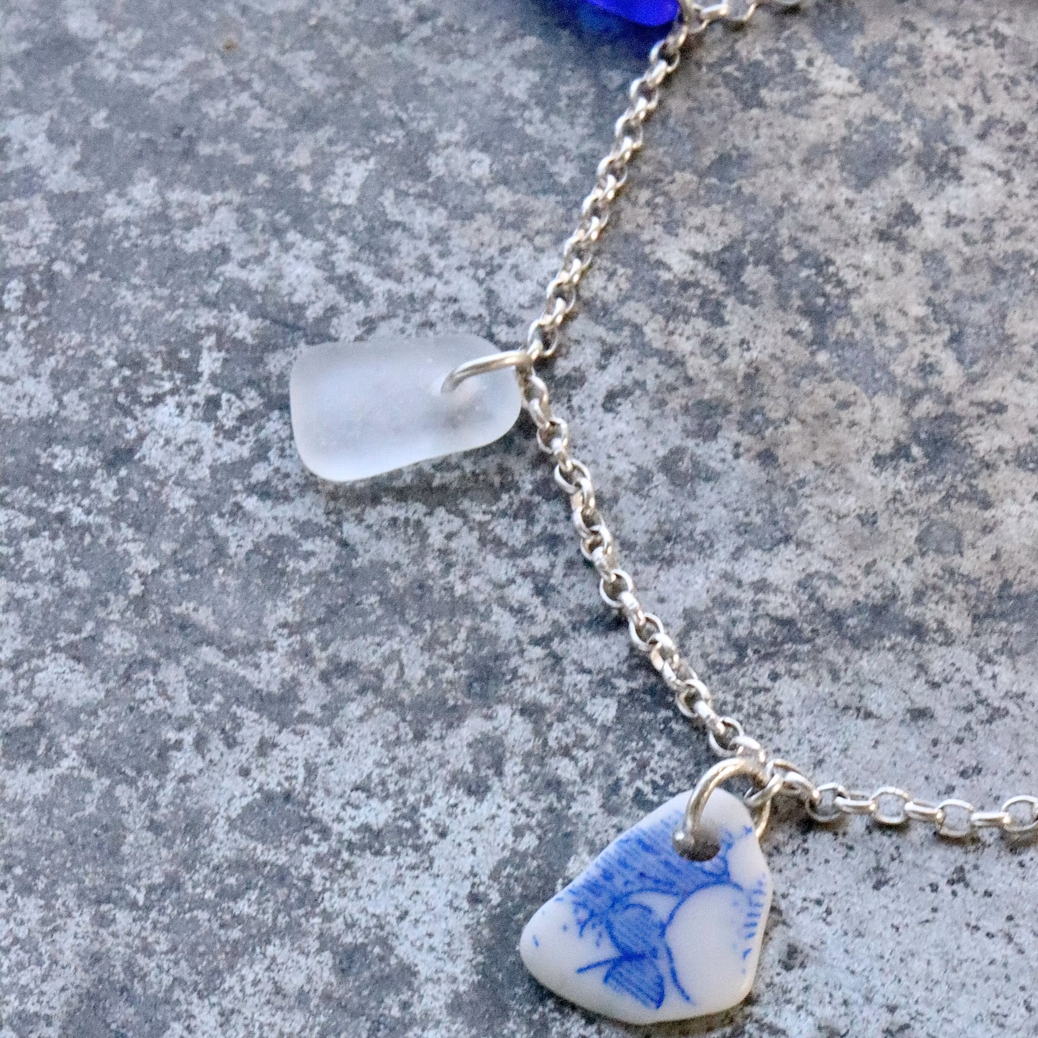 Fem matchande havsglas och havsporslin i kedja av äkta silver, justerbart till 17 eller 19 cm.