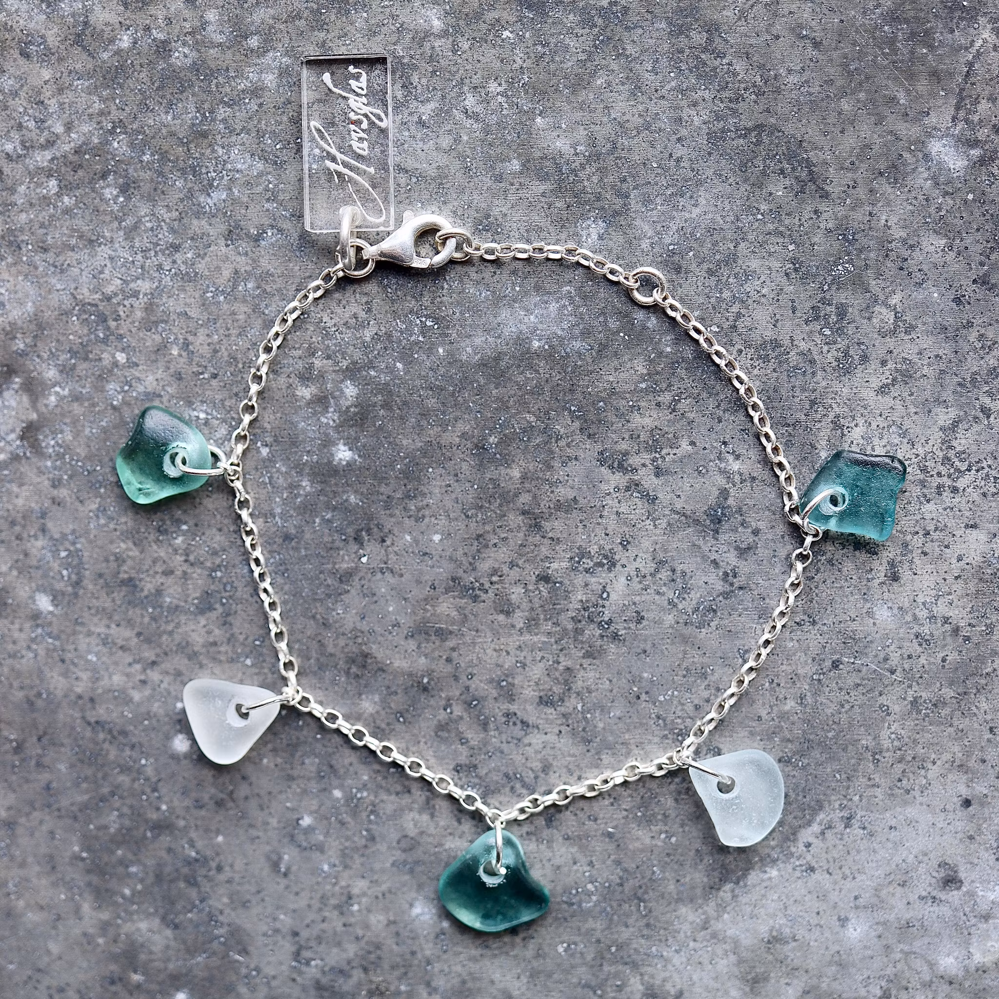 Fem matchande havsglas i kedja av äkta silver, justerbart till 17 eller 19 cm.