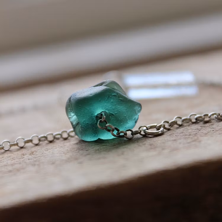 Havsglaset är samlat längs Skånes stränder och helt obearbetat, endast varsamt tvättat och borrat.