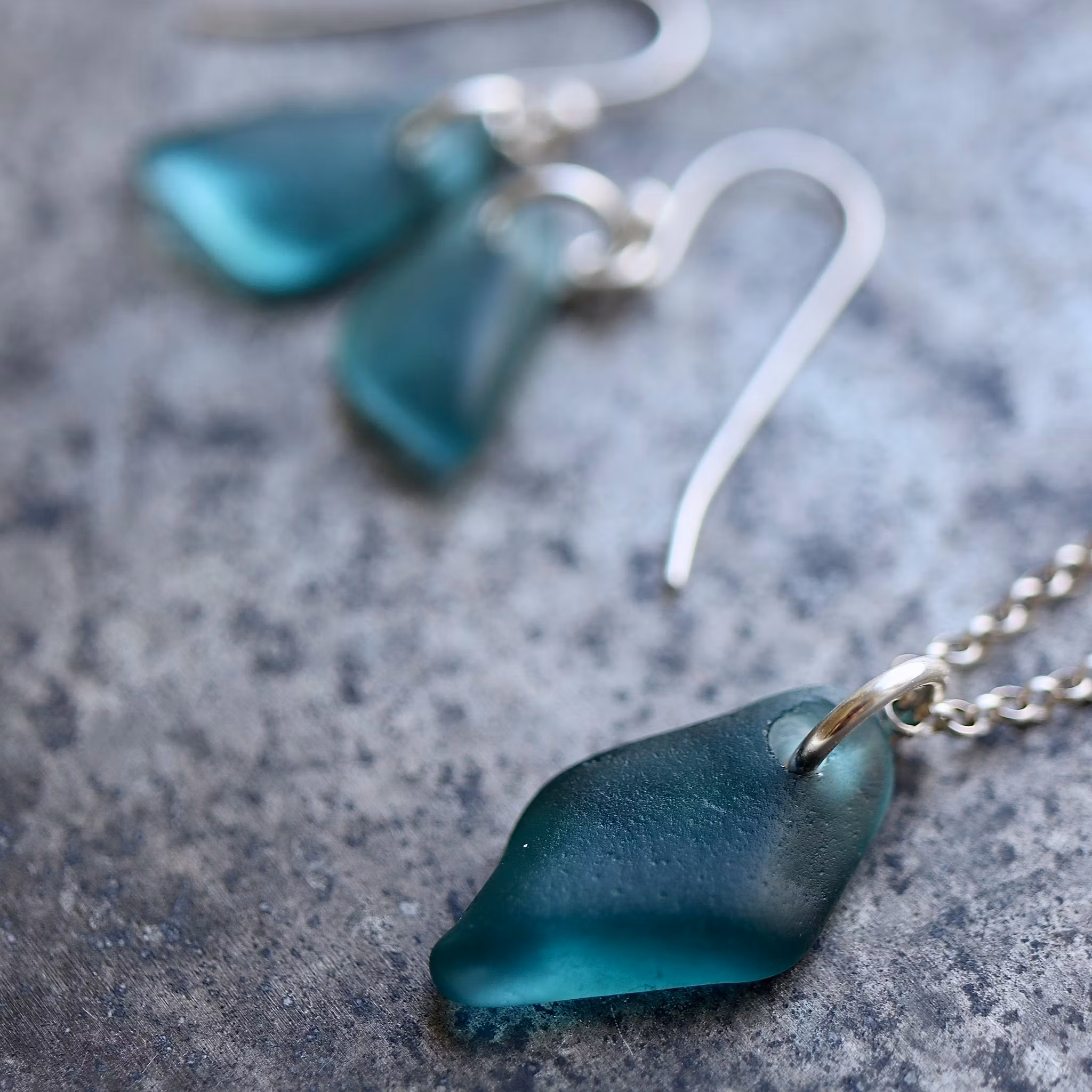 Örkrokar av äkta silver, observera att de två havsglasbitarna i paret inte är identiska, utan varierar en aning i form, tjocklek och färgnyans.